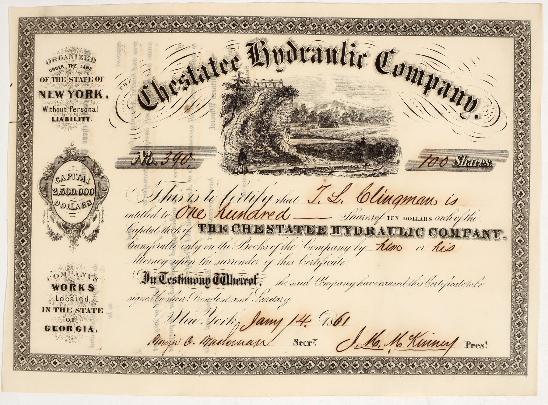 I/U. The Chestatee Hydraulic Co. Stock., issued 1861, located in Georgia. A California style hydraulic mining scene is the vignette. The Chestatee Hydraulic Company was at the forefront looking at the new hydraulic mining techniques being used in California and determining the practicability. The Chestatee Hydraulic Company was at the forefront looking at the new hydraulic mining techniques being used in California and determining the practicability of working the placer deposits in Georgia by these hydraulic method with water from the Chestatee River. As such they commissioned Blake to report to them as early as 1858. The Mining Magazine and Journal of Geology edited by Blake reports in 1860 that the Chestatee Hydraulic Company the canal of the Chestatee Hydraulic Company about twelve miles in length is designed to convey the water of the Chestatee River to the placers in the vicinity of the Loud deposit. It is not quite complete though experimental washing with one pipe was commenced in May at the upper margin of the gold belt.