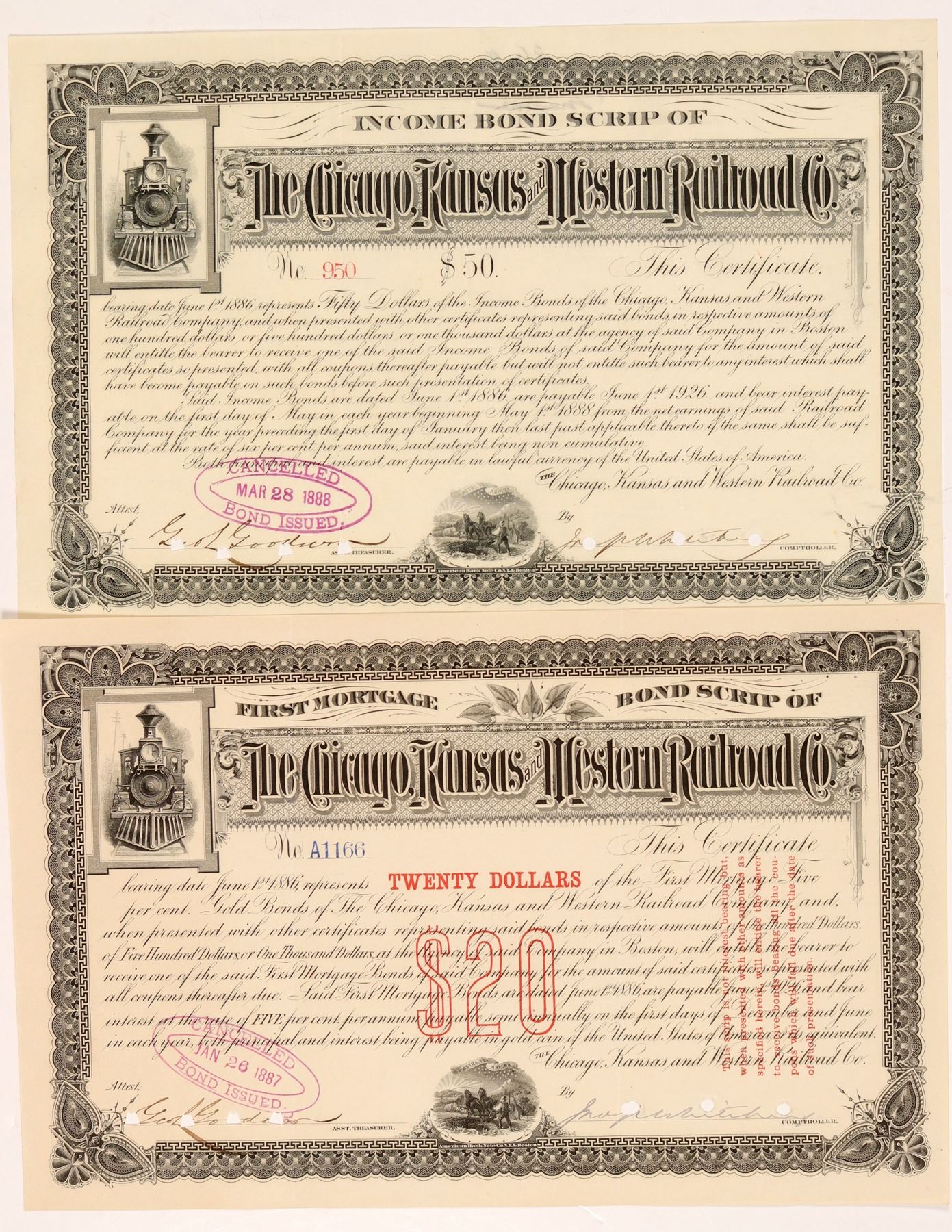 2 certificates. The Chicago, Kansas and Western Railroad was formed in 1886 by combining 10 smaller railroads.Starting operations in 1886 and stopped service in 1901 for a total period of operations of 15 years.The company was sold to the Santa Fe Railroad in 1901. Both are I/C, BLACK, no seal, two vignettes : top frontal view of locomotive, bottom state seal. American Bank Note CO. printer. AU. #950, $50 , 6% , due 1926. Issued June 1, 1886 Income Bond Script. #A1166, $20 5%, First Mortgage Gold due 1926. Issued June 1, 1886. Ken Prag Collection