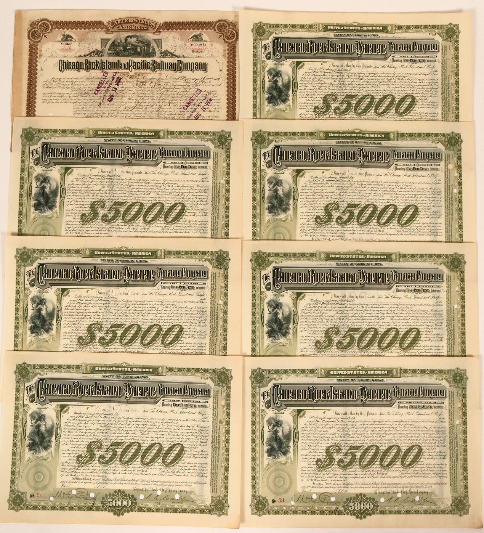 8 certificates. This company was merged with others into the Chicago, Rock Island and Pacific Railroad in 1866 and was reorganized in 1880 under the same name but with the word Railway in the title. Seven, U/C, signed $5000, 5% 30 Debenture Bond. dateline 18__. Numbered 51-51 and 58-62. Green, vignette female w/sickle. $5000 green underprint. One , #1632, Certificate for 25 bonds, issued 1888 to Drexel Morgan and Co. signed president, Brown, vignette 4-4-0 @ depot. These are large horizontal bonds 14x9". Western Bank Note Printer on all. VF-EF.