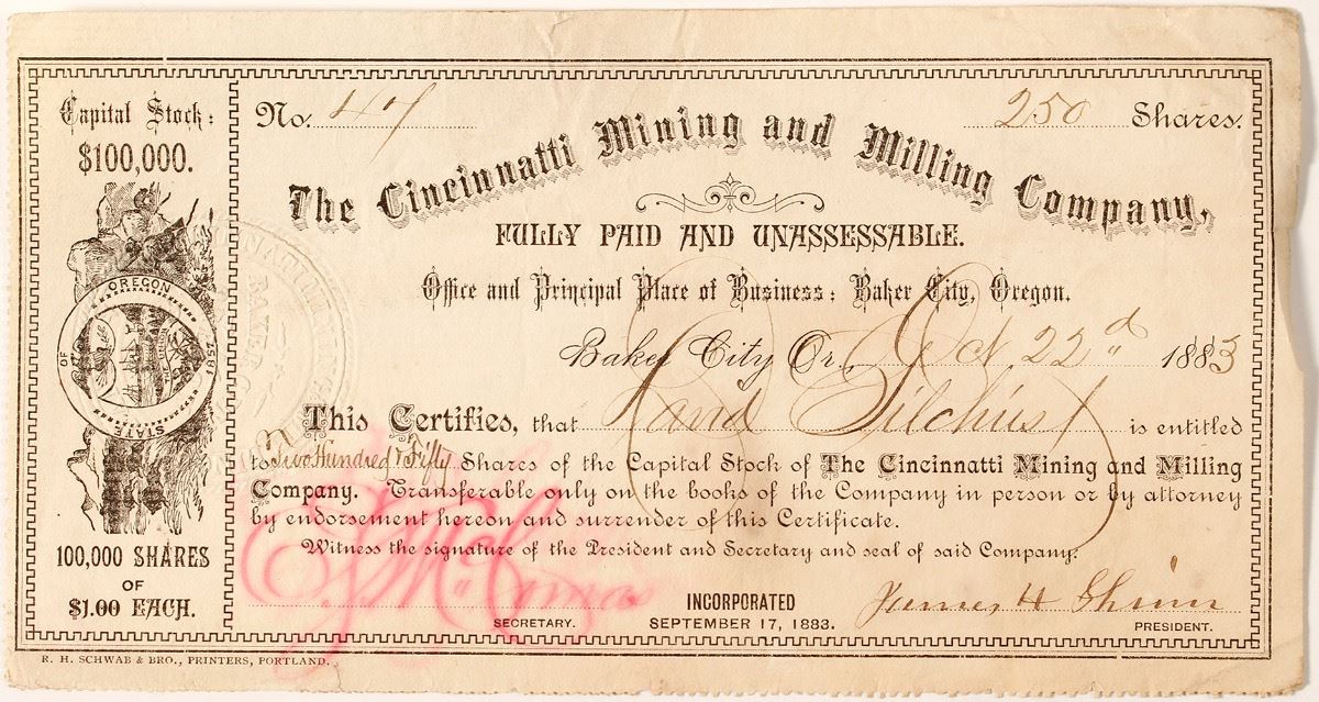 The Cincinnati Mining and Milling Company. No. 47, issued for 250 shares in Baker City on Oct. 22nd, 1883. Not cancelled. Oregon state seal on left. Some ink smudging. According to the 1916 "Mineral Resources of Oregon" by the Oregon Bureau of Mines and Geology, the company was active in the Pedro Mountains of the Rye Valley Mining District. (Prag Collection). City: State: Oregon Date: 1883 ID# 44801