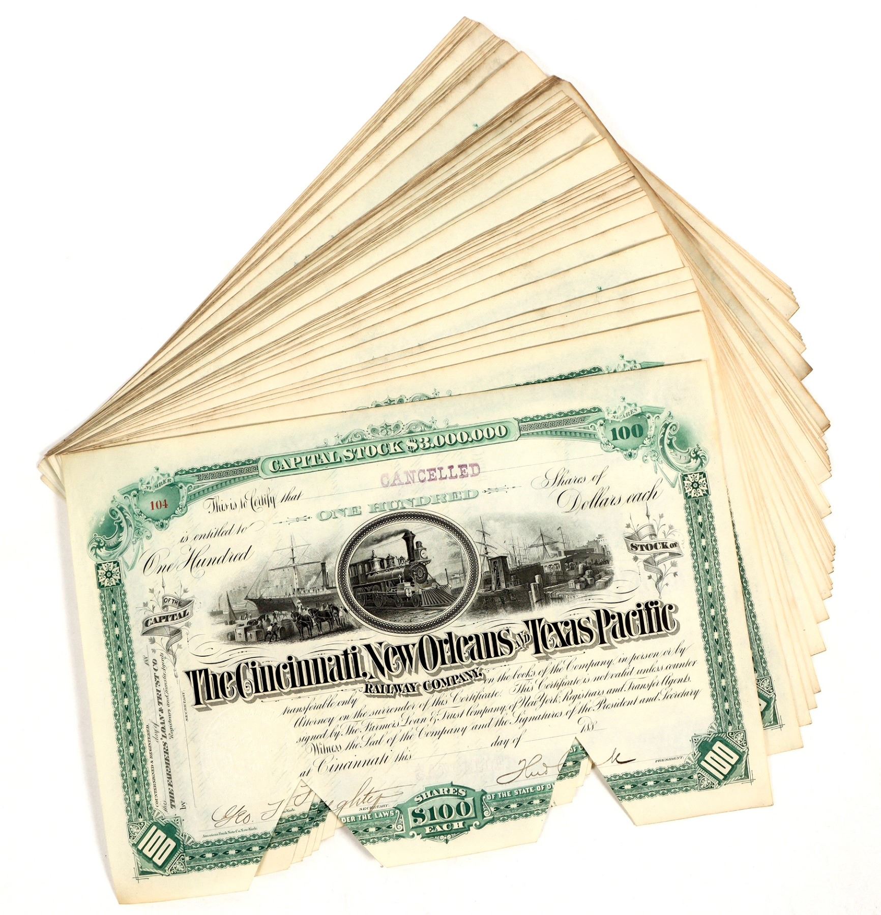 Lot of 60. All signed but unissued. These have two large cancellation triangle cuts on bottom of certificates. The Cincinnati, New Orleans and Texas Pacific Railway Co. Stocks