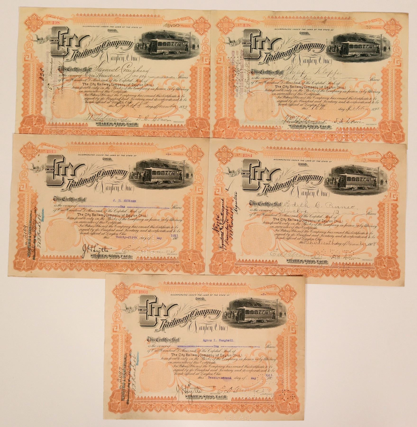 5 certificates. Incorporated in 1893. The present City Transit Company was formed in 1955 through a merger of the City Railway Company (incorporated in 1893) and the Dayton & Xenia Railway. All certs, common, IC, $100 par , Issued 1893-1911 . embossed seal, Green, , vignette bare breasted female w/cherub, two have revenue stamps. New York Bank Note Co. VF
