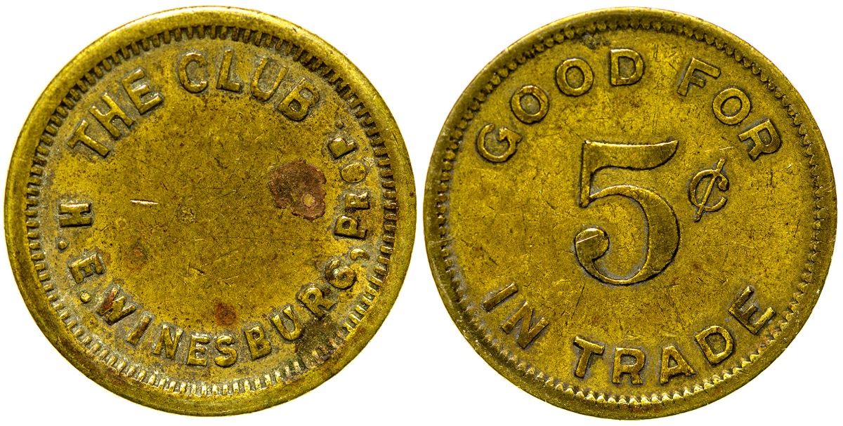 The Club / H. E. Winesburg, Prop.// GF / 5c / IT. Round, brass, 20mm. (Svoboda Collection) City: Broadview State: Montana Date: HWAC# 35051