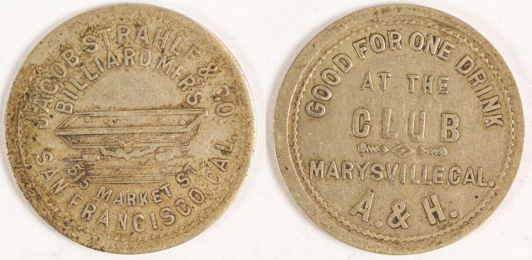 Obv.: Good For One Drink / At The / Club / Marysville, Cal. / A & H.; Rev.: Jacob Strahle & Co. / Billiard Mfrs. / (pictorial pool table) / 515 Market St. / San Francisco, Cal. Wm, rd .24 mm. Choice rarity. Daniel Manasselian Collection. State: California City: Marysville Date: ID# 78230