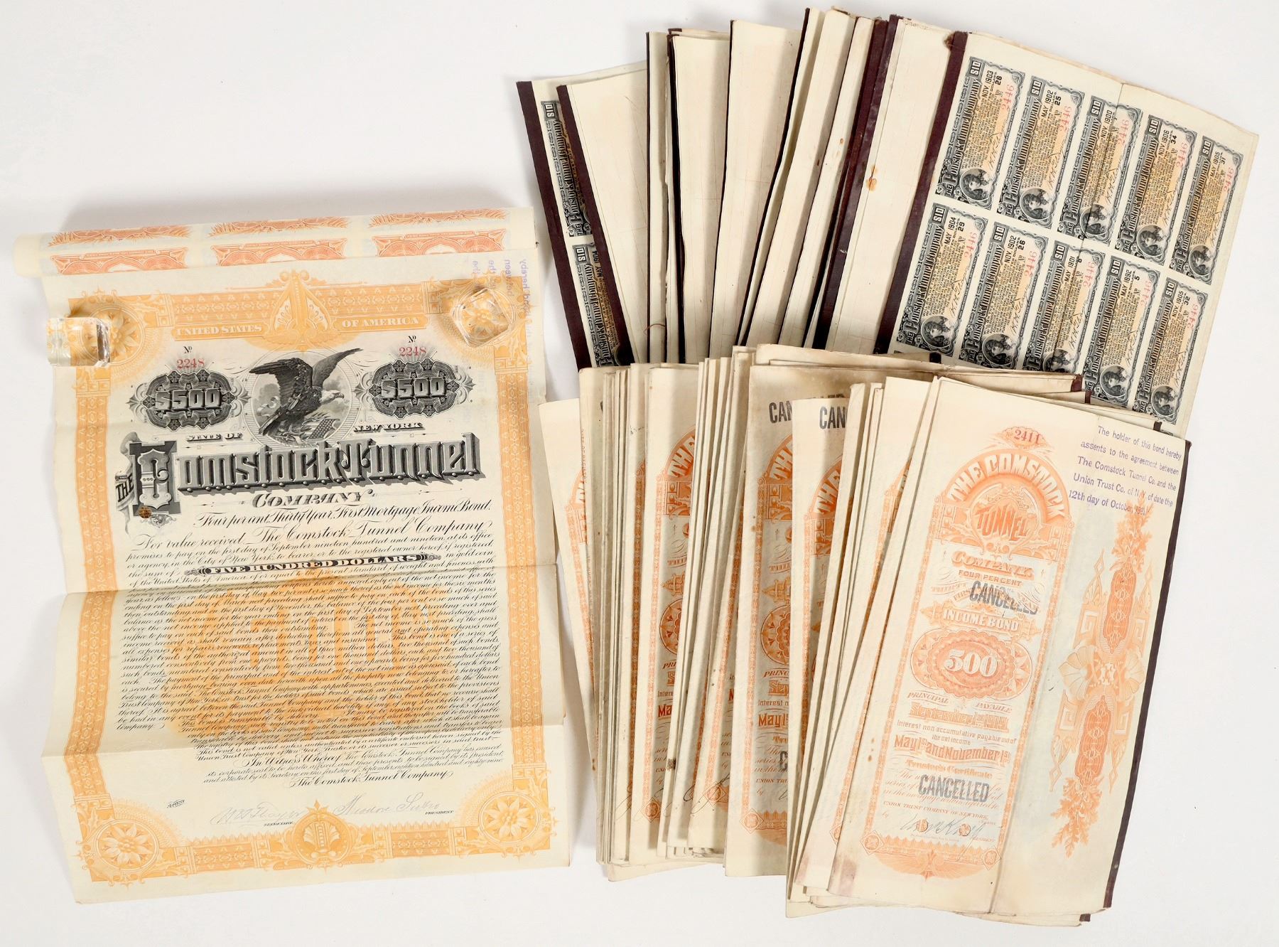 Lot of approx. (+200) foldout stock certificates, bound with (2) sheets of $10 coupons, issued by "THE COMSTOCK TUNNEL COMPANY." This is the famous Sutro Tunnel, very significant. These are signed by Theodore Sutro, brother of Adolph Sutro. Adolph Sutro, a German Engineer, was famous not only on the Comstock for his drainage tunnel system, but for being the Mayor of San Francisco. Theodore took over the company after Adolph returned to San Francisco. Unique and historic lot, please see photos.