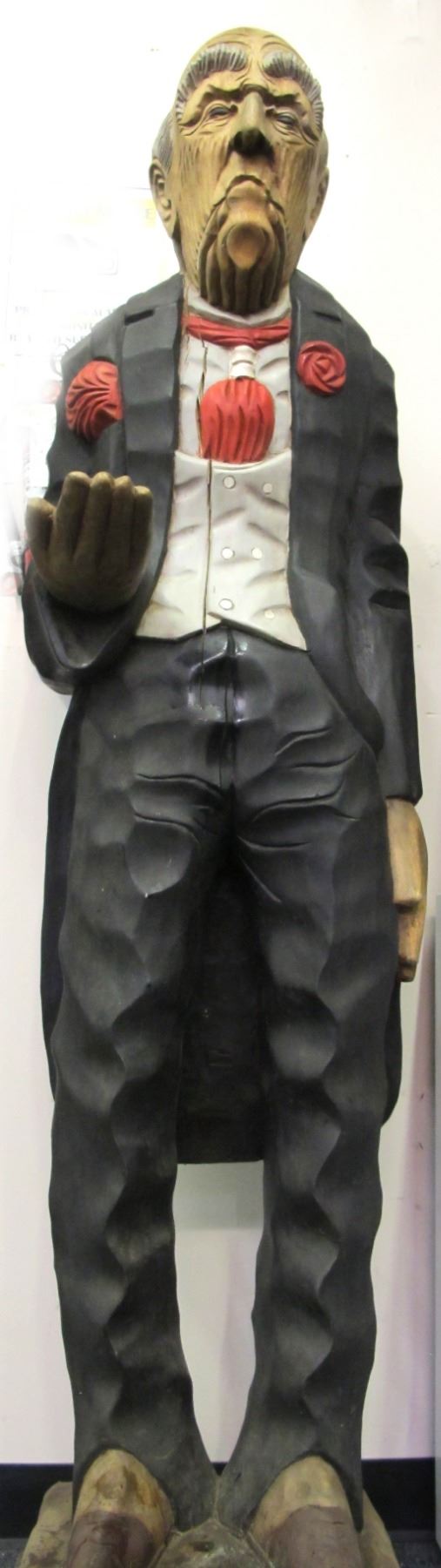 This butler figure is solid wood and nicely carved. He appears as a very old man, has his had out to carry a tray. He is wearing a tuxedo, vest and red cravat. 70" x 17" x 17". Crack in chest area. This is a fabulous piece of history, your own personal butler who will never complain! From the Reindeer Lodge, located on a horseshoe curve along Mount Rose Highway between the ski resorts and Reno.It has seen much in its 60 years of existence. What was once the Rosemount Lodge, an upscale establishment catering to local skiers, changed names and operators multiple times on its path to becoming the funky property known as Reindeer Lodge. In the record-breaking winter of 2016–17, after years of disrepair, the roof collapsed, about 25' of snow caving in around the fireplace that had for decades warmed skiers coming off the slopes.