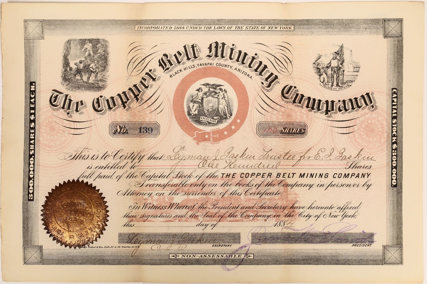 Cert #139 issued in 1884 to Leyman J. Zaskin for 100 shares. Signed by James W. Smith as president and Leyman Zaskin as secretary. Vignette of the NY state seal at the top center and a mining scene at left. 7.5 x 11." Uncancelled. Black Hills, Yavapai County, Arizona. This district later became Jerome, one of the best copper camps in the west!