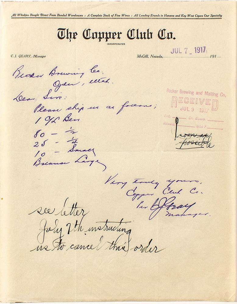 Dateline McGill, Nevada, Jul 7, 1917. Addressed to Becker Brewing & Malting Company in Ogden, Utah, this letter is an order for alcohol. Signed by C.J. Geary as manager. 8.5" x 11" in very good condition.