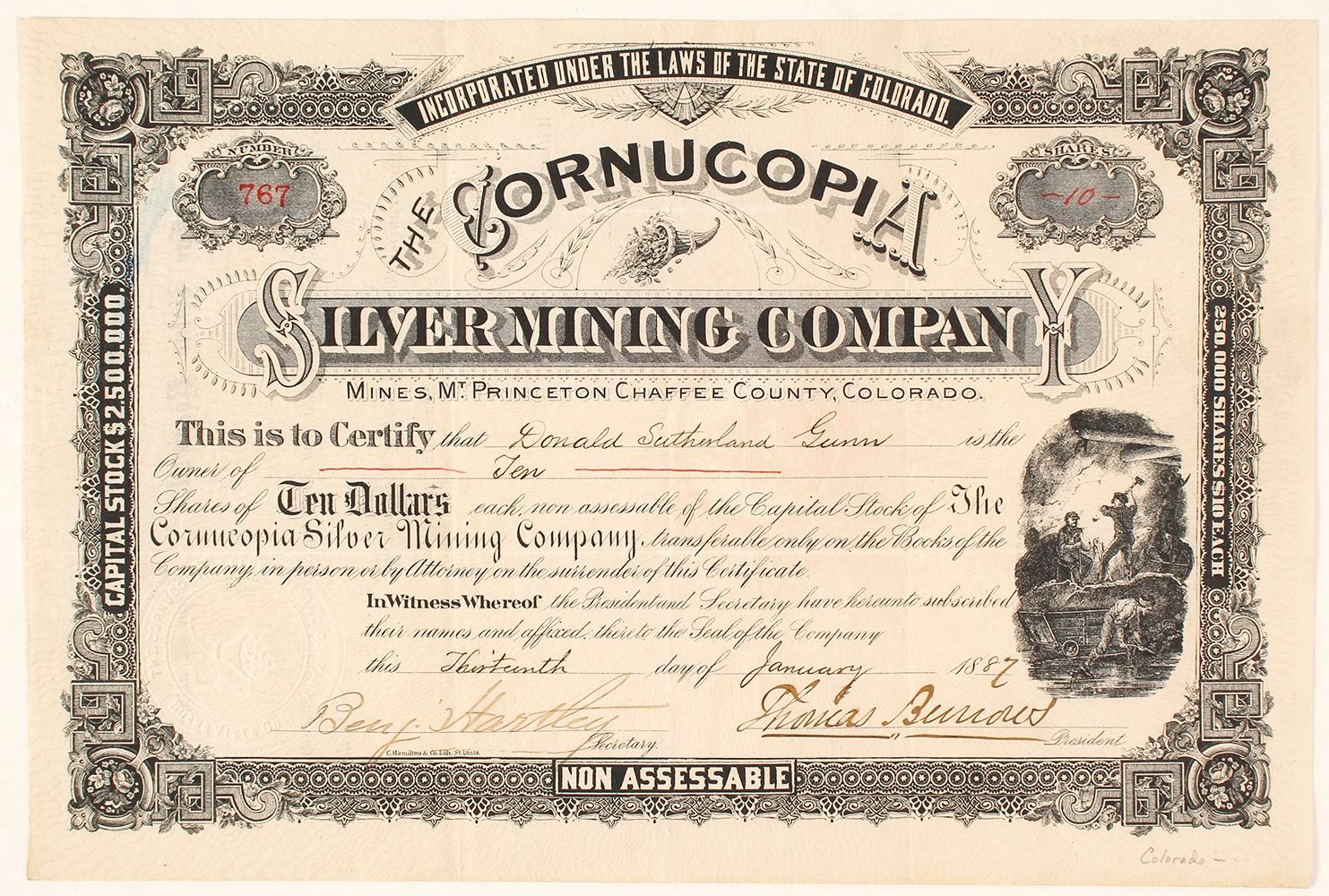 Location printed on certificate: Mines Mt. Princeton, Chaffee County, Colorado. Inc. in Colorado. No. 767, issued for 10 shares to Donald Sutherland Gunn on Jan. 13th, 1887. Signed by Thomas Burrows (?) as president and Benj. Hartley as secretary. Not cancelled. Beautiful logo and underground mining vignette. Printed by C. Hamilton & Co., St. Louis. Folds, very fine. 7.25 x 10.75" In 1884, the company was commencing work on a tunnel using an Ingersoll drill. (Al Adams Gold Rush Memorabilia Collection) Date: Location: Chaffee County, Colorado HWAC# 58578