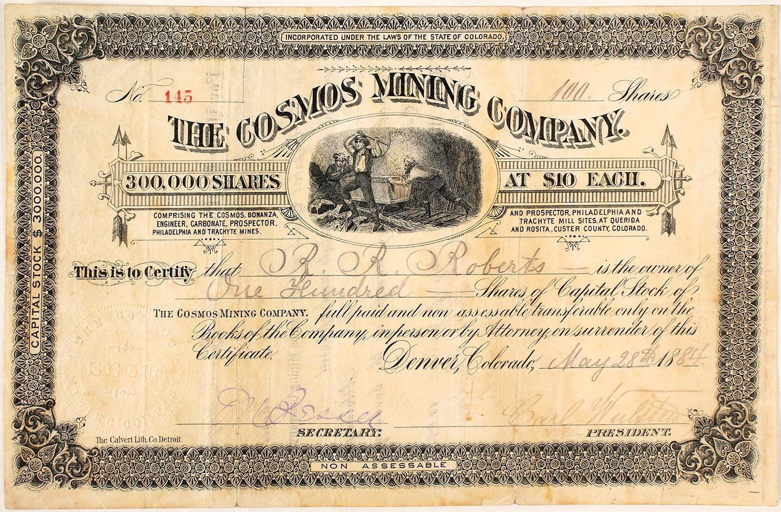 Very rare. Inc. in Colorado. No. 145, issued for 100 shares to R.R. Roberts on May 28th, 1884 in Denver. Signed by Carl Walsted, vice president, and the company secretary. Not cancelled. Pinholes, heavy folds and soiling. Properties and location printed on the stock below the logo: The Cosmos, Bonanza, Engineer, Carbonate, Prospector, Philadelphia, and Trachyte Mines and the Prospector, Philadelphia and Trachyte Mille Sites at Querida and Rosita, Custer County, Colorado. Not listed in Filer. (Al Adams Gold Rush Memorabilia Collection) Date: Location: Querida & Rosita, Colorado HWAC# 58445