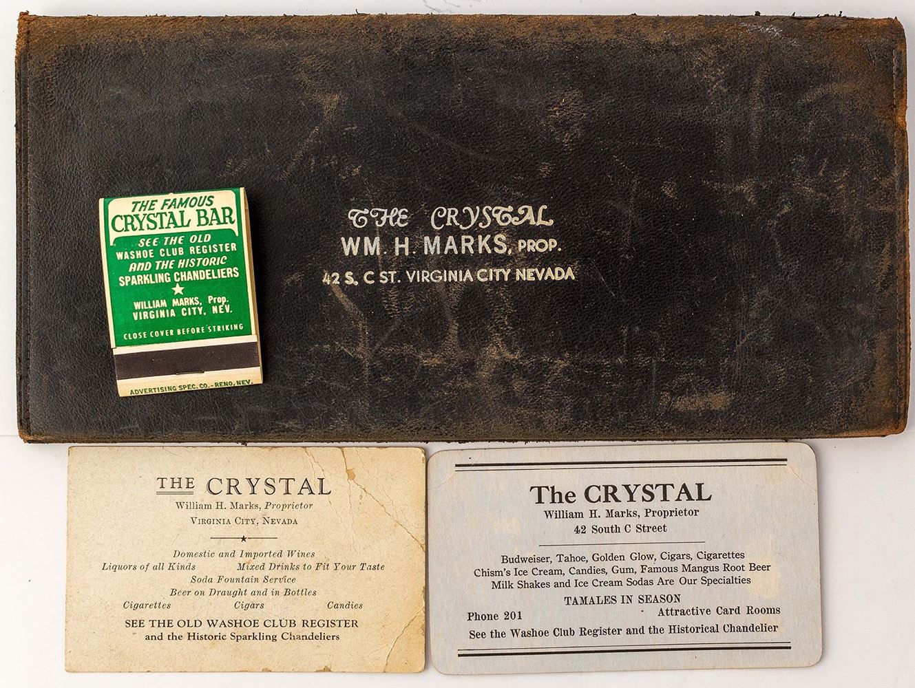 William H. Marks is the proprietor of this iconic saloon at 42 South 'C' Street in Virginia City. 4.5 x 9.75". Inside are three treasures: 1) A blue business card, phone 201, tamales in season, Bud, etc. Marks, Prop. 2) White business card. Marks Prop. Wines, cigars, candies, etc. 3) Match book bull of matches. Date: c1950 Location: Virginia City, Nevada HWAC# 48139