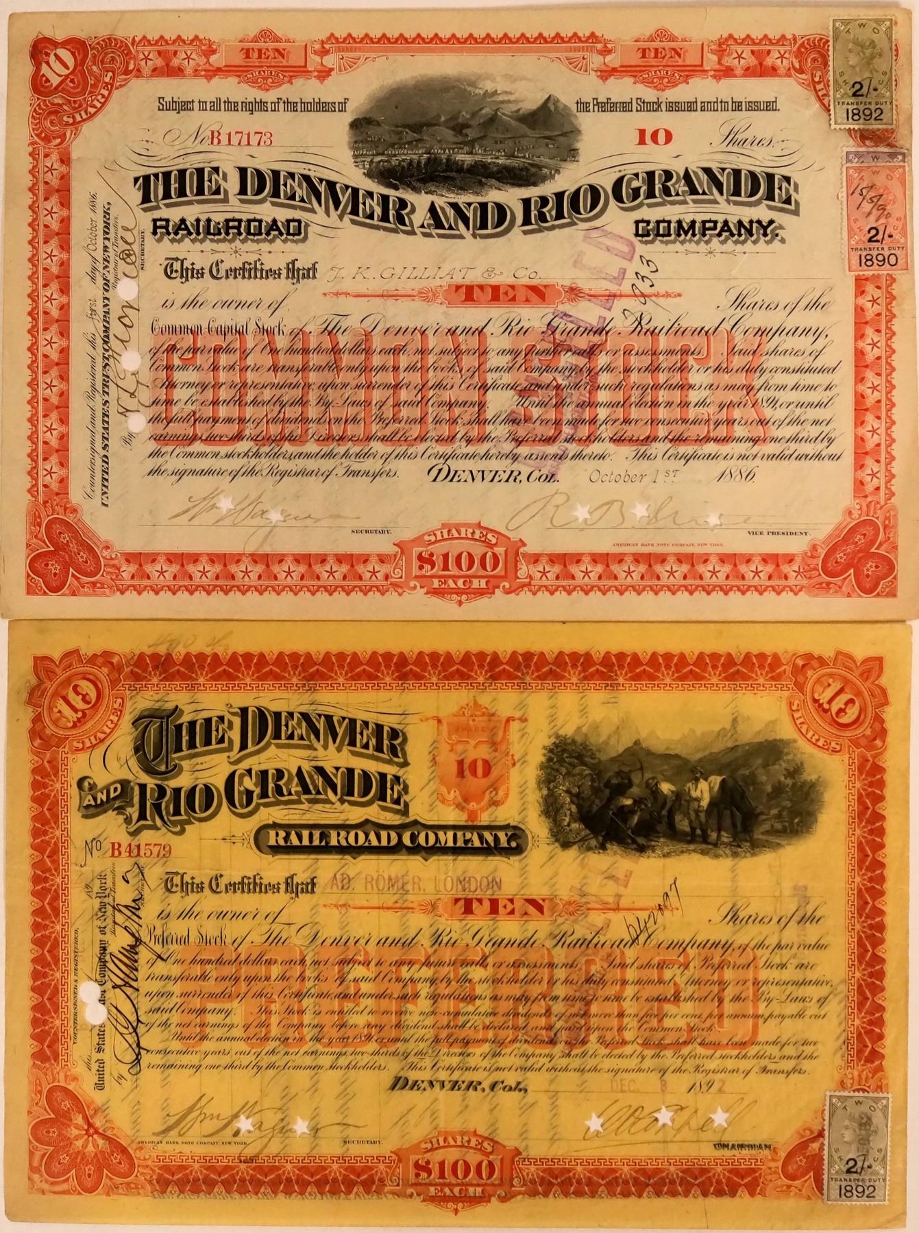 2 certificates. Incorporated on October 27, 1870 by General William Jackson Palmer as the Denver & Rio Grande Railway. Sale of the original Denver & Rio Grande Railway resulted within two years and the new Denver & Rio Grande Railroad took formal control of the property and holdings on July 14, 1886 with Jackson (Palmer) appointed as president. 1. #B17173, I/C, 10 shares @ $100 ea. issued Oct 1, 1886 signed Pres/Sec, Red/Orange, no seal, vignette Denver w/Rockies background. COMMON STOCK underprint, Two revenue stamps on right. American Bank Note Co. EF 2. #B41570, I/C, 10 shares @$100 ea. issued Dec8, 1892 signed Pres/Sec, Red/Orange, no seal, vignette to prospectors, revenue stamp lower left, PREFERRED underprint, American Bank Note Co. VF