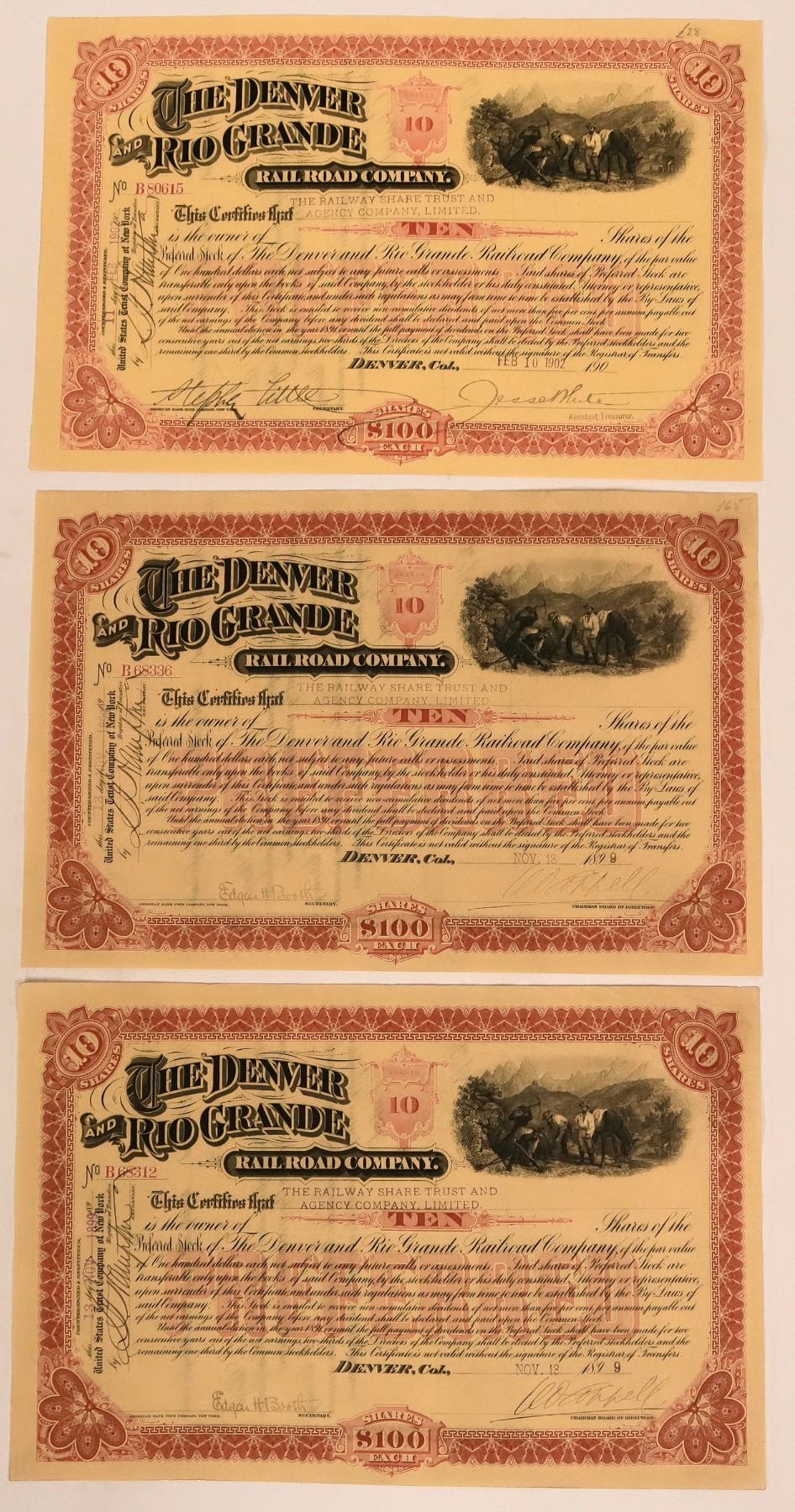 3 certificates. Incorp 1870 by General William Jackson Palmer , a narrow-gauge line running south from Denver, Colorado. It served mainly as a transcontinental bridge line between Denver, and Salt Lake City, Utah. All certificates : I/U, Orange-red, vignette miners w/mule, PREFERRED underprint, 10 shares @ $100 ea. no seal. Issued 1899-1902. American Bank Note Co. EF.