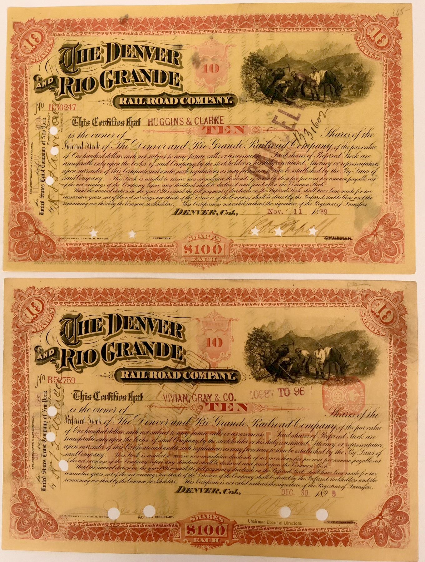 2 certificates. Sale of the original Denver & Rio Grande Railway resulted the new Denver & Rio Grande Railroad took formal control of the property and holdings on July 14, 1886 withGe, William S. Jackson appointed as president. Both certs I/C, 10 shares @ $100 ea., Red-Orange, no seal, vignette miners w/mule. PREFERRED in underprint. Dividend stamping on back. American Bank Note printer. #B52759 issued Dec 30, 1895, imprinted revenue stamp, and B 30247 issued Nov11, 1889. VF.