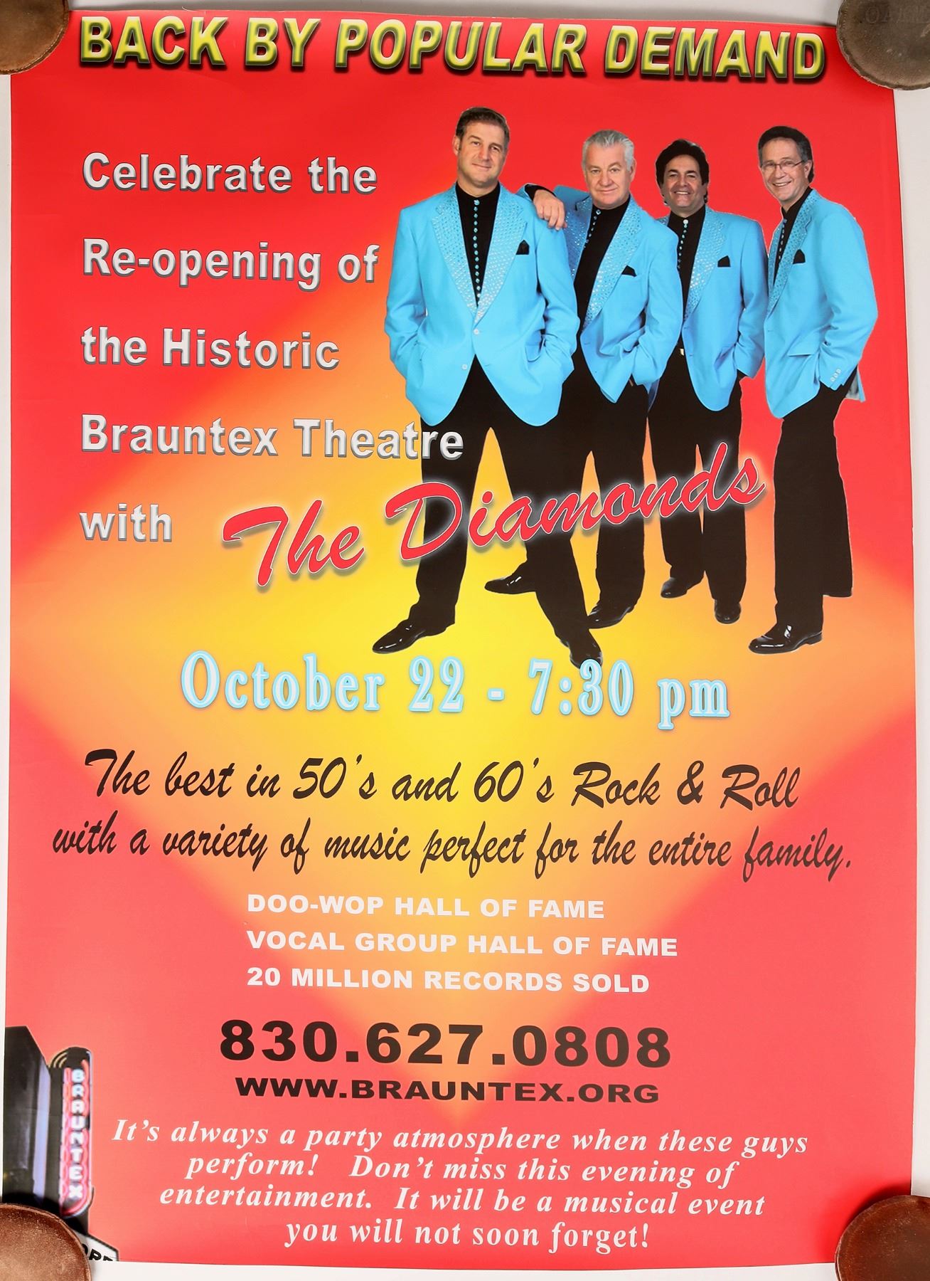 Advertising poster for "The Diamonds" concert at Brauntex Theater in Texas. "The Diamonds" were a Canadian quartet that performed 1950s and 60s rock n' roll. This concert was held to celebrate the grand reopening of the Brauntex Theater. Poster is very vibrant with a red and orange background. Approx. 27 x 40 inches, good condition.