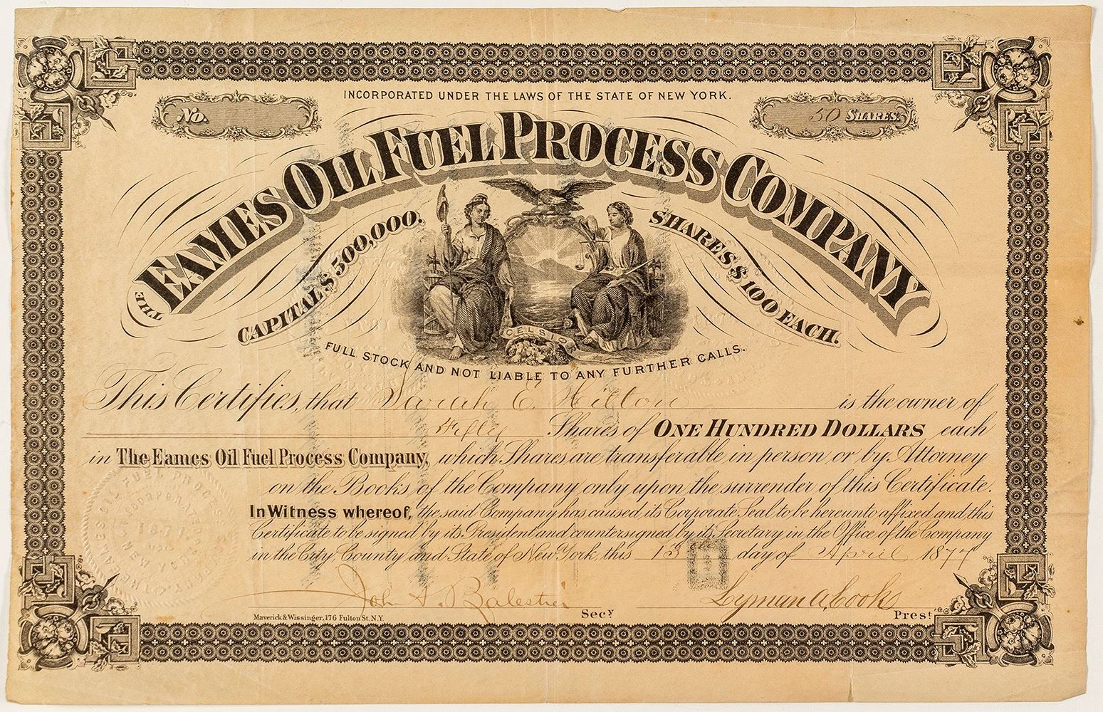 Early oil piece. Inc. in New York. No. 225, issued for 50 shares to Sarah E. Hilton on April 13th, 1877. Signed by Lyman Cook as president and John Balester as secretary. Not cancelled. Allegorical vignette at center. Printed by Maverick & Wissinger, NY. According to Engineers & Engineering Vol. 1-2 (1880), the company developed a process to use crude oil as a fuel in the manufacture of blooms at an iron works facility in Titusville, PA. Both furnaces employed were capable of smelting 30 tons of iron a day using 20 crude barrels of oil. 7.5" x 11.5" Folds and toning. Date: 1877 Location: Titusville, Pennsylvania HWAC# 39027