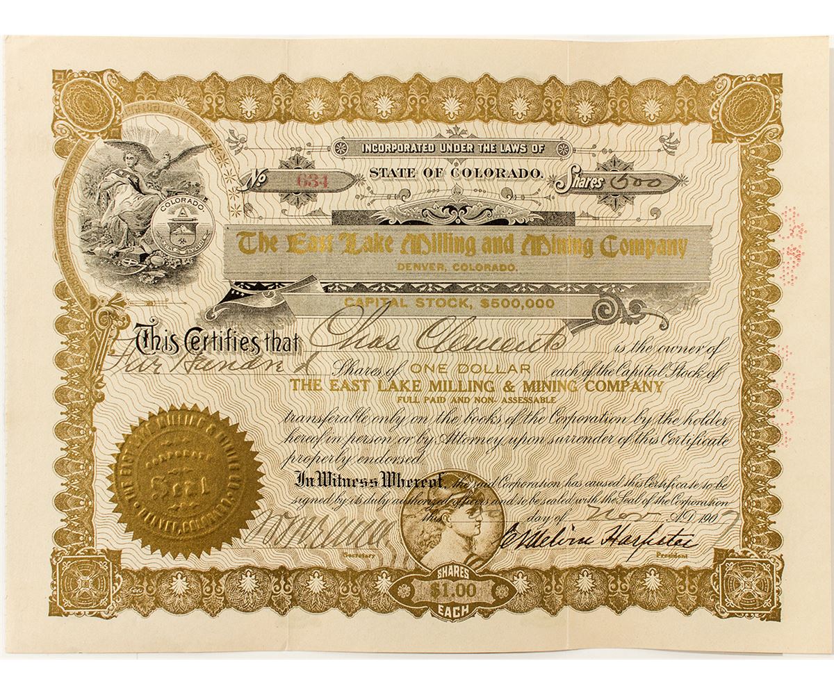 Inc. in CO. U/C. No. 634, issued for 400 shares to Chas. Clements. Corporate signatures. Gold border and seal. Allegorical vignette. Folds, otherwise nice.