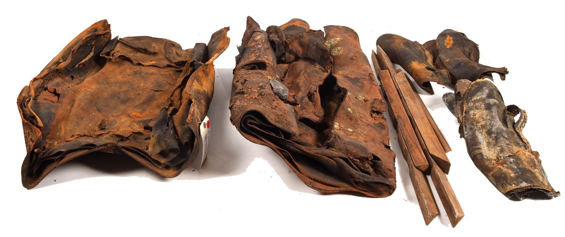 Leather trunk recovered in two pieces from the debris field of the S.S. Central America shipwreck. The trunk was owned by Ansel & Adeline Easton, two newlyweds who were traveling to New York on the ill-fated voyage. The heavily tanned leather survived more than a century on the seafloor, and the contents of the trunk have provided a snapshot of 19th century fashion. In these two images, the bottom portion of the trunk is on the far left, the top of the trunk is in the middle, and the stabilizing frame and interior pieces are on the far right.