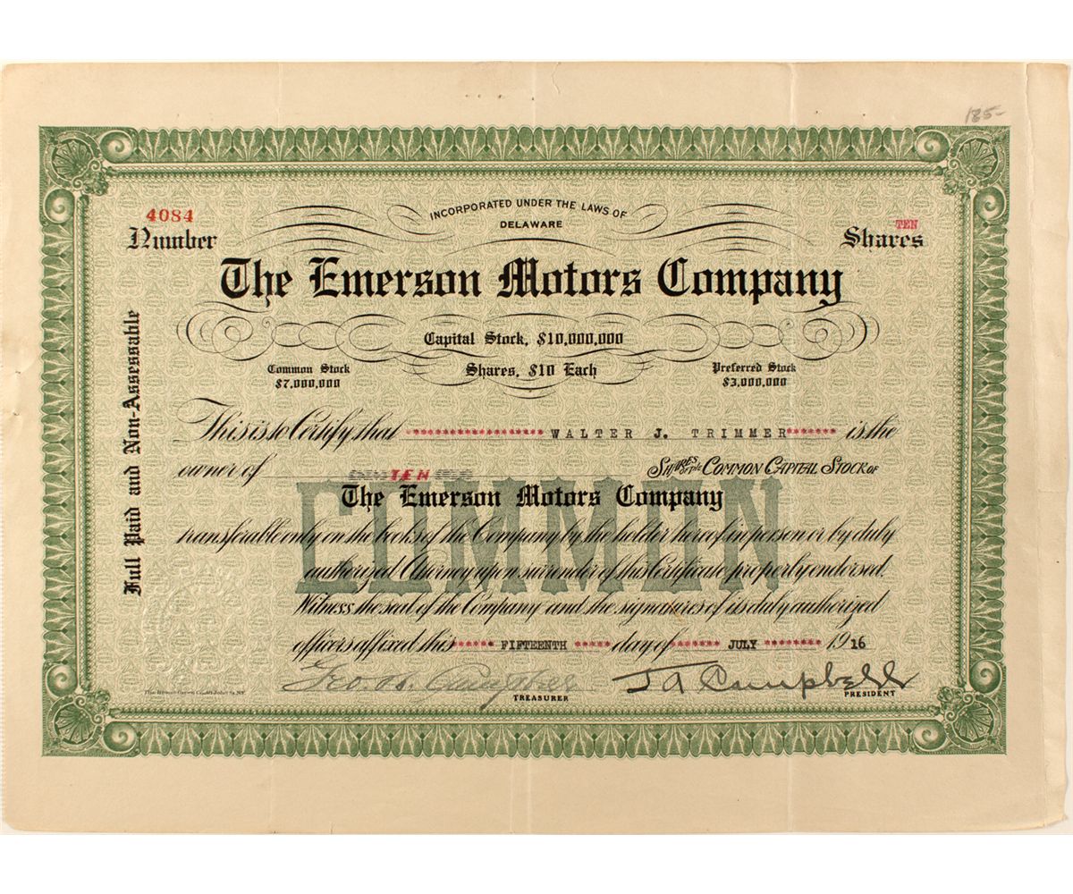Cert # 4084 for ten shares issued to Walter Primmer. Prag Collection