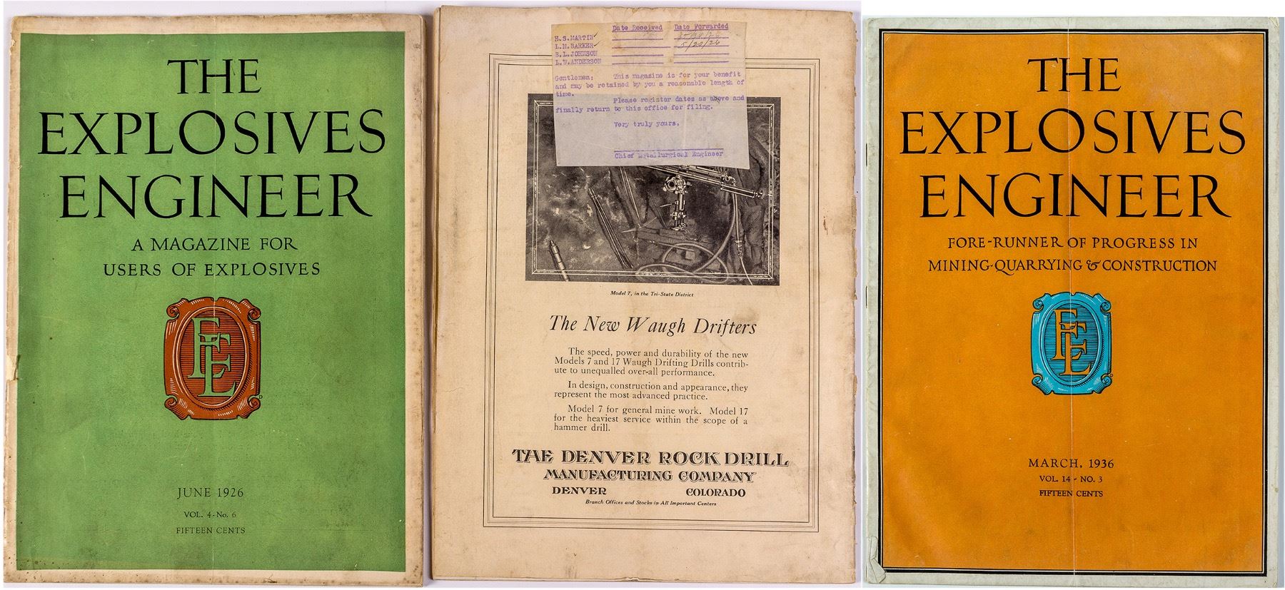 Three issues of "The Explosives Engineer Magazine" "A Magazine for users of explosives" or "Fore-runner of progress in mining-quarrying and Construction". May 1926, June 1926, March 1936. Magazines are 9 x 12 inches. State: City: HWAC#: 47447 Date: