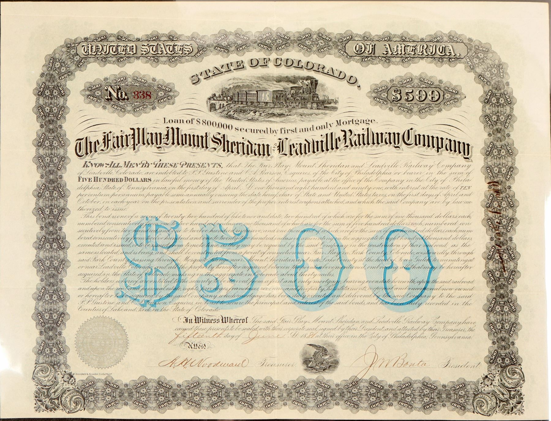 #338 of 2200 authorized (1000 are $500). I/U. $500 10% 10 year First and Only Mortgage bearer bond dues 1891. Issued June 15, 1881 signed J.M. Bonta President, BLACK, embossed seal, vignettes: bottom eagle on union shield wings spread l-r, top 4-4-0 train crossing bridge. "$500" blue underprint, "$500" printed in ovals throughout the border. Brueker & Kessler Litho. printer. EF. Only three are known. Ken Prag Collection