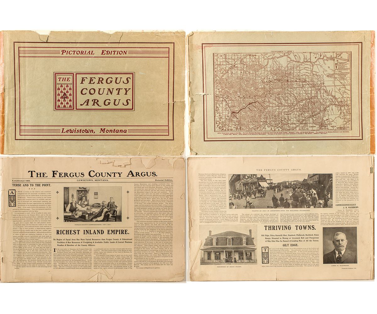 Diversified information concerning Fergus County, its history and resources. Map on back cover, dated Sept. 1, 1899. Soft green cover, some tearing, taped binding, inside pages loose and torn.10.5" x 16") 56 pp.