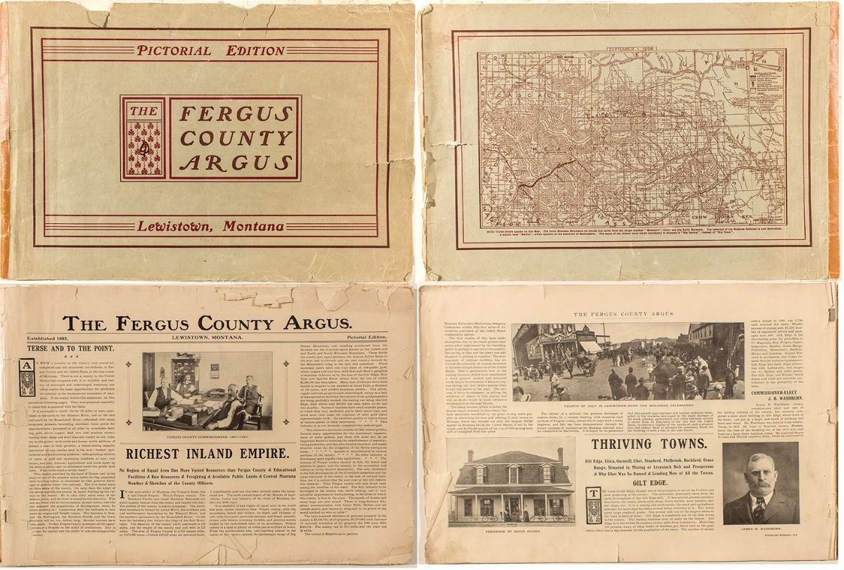 Diversified information concerning Fergus County, its history and resources. Map on back cover, dated Sept. 1, 1899. Soft green cover, some tearing, taped binding, inside pages loose and torn.10.5" x 16") 56 pp. State: Montana City: Lewistown Date: c.1900 FHWAC#: 27052