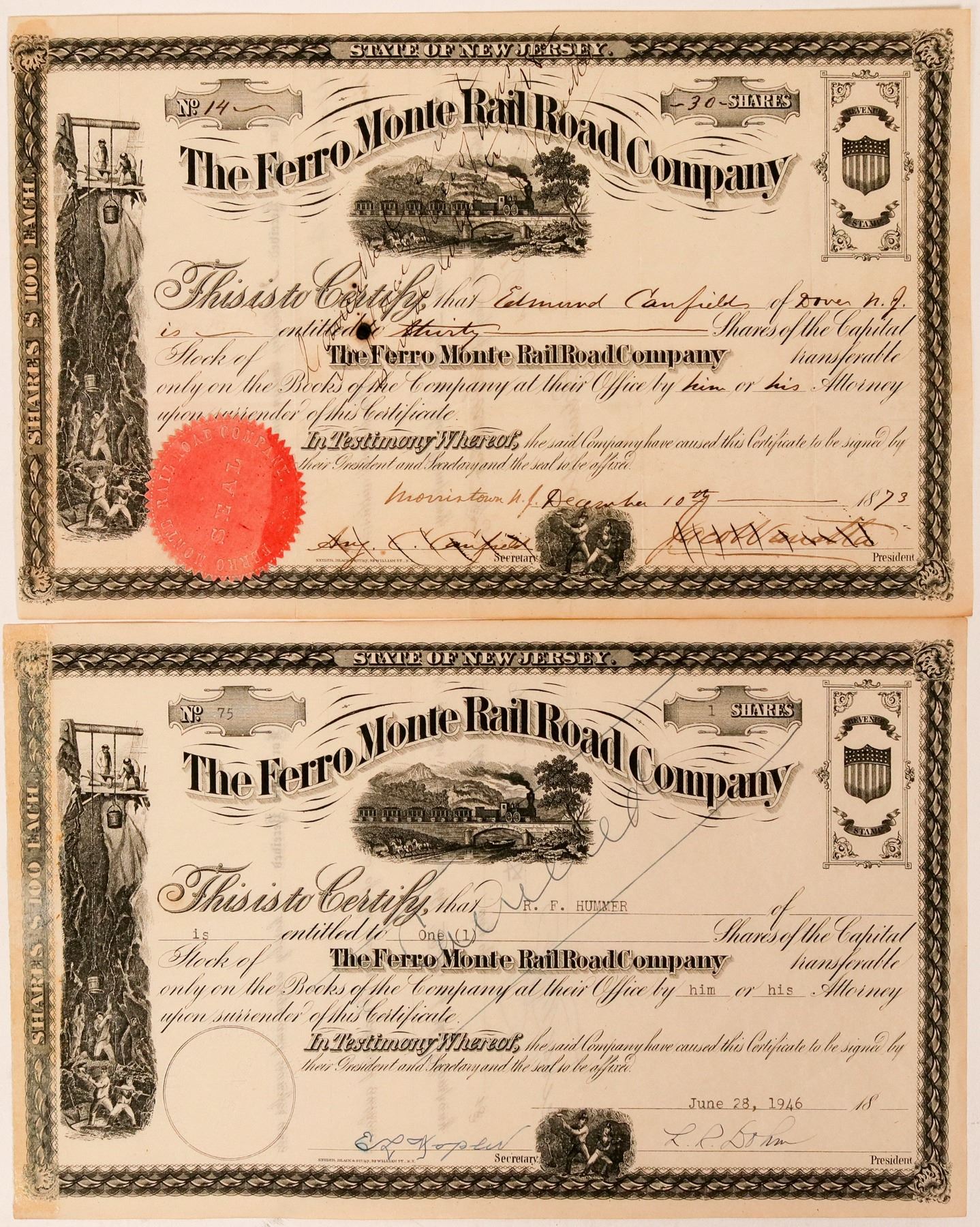 2 certificates. Incorp 1869. Ferro Monte Rail Road served the Dickerson Mine of New Jersey. I/C, Black, three vignettes: coal train l-r, miners working mine, bottom two miners. Snyder, Black & Sturn printer. #14 issued Dec 1873, red embossed seal. #75 issued Jun 1946 (certificate dateline 18__), embossed seal. VEF