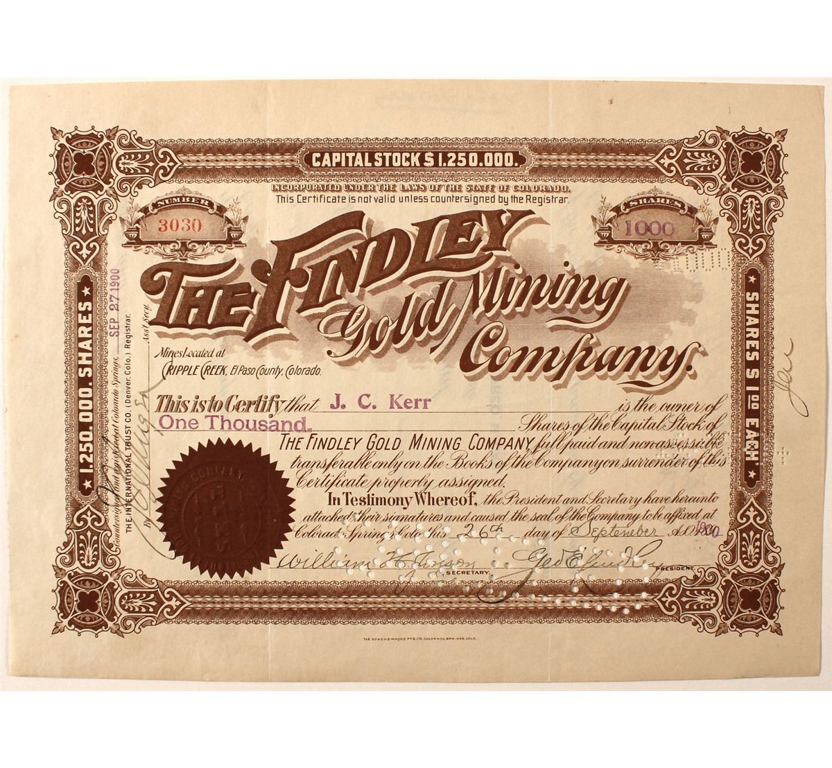 Cripple Creek District, El Paso County. Incorporated under the laws of the State of Colorado. No. 3030 issued for 1000 shares to J.C. Kerr. Datelined Colorado Springs, September 26, 1900. Signed by Geo. C. Findley as President and William Jonson as Secretary. Cancelled by hole punch, located on southeastern slope of Bull Hill, just above the town of Independence. Date 1900 Colorado Springs , CO hwac 20910