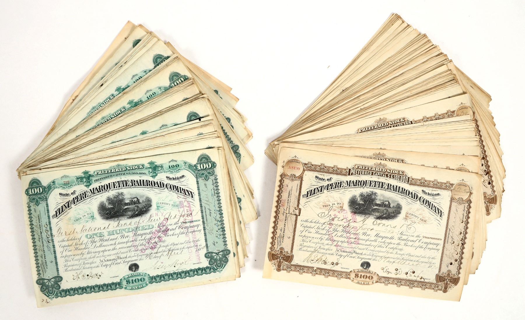 100+. I/C. Issued 1889-90. VG or better. The Flint and Pere Marquette Railroad Co. 1857-1899. Merged into the Pere Marquette Railway. Two varieties.
