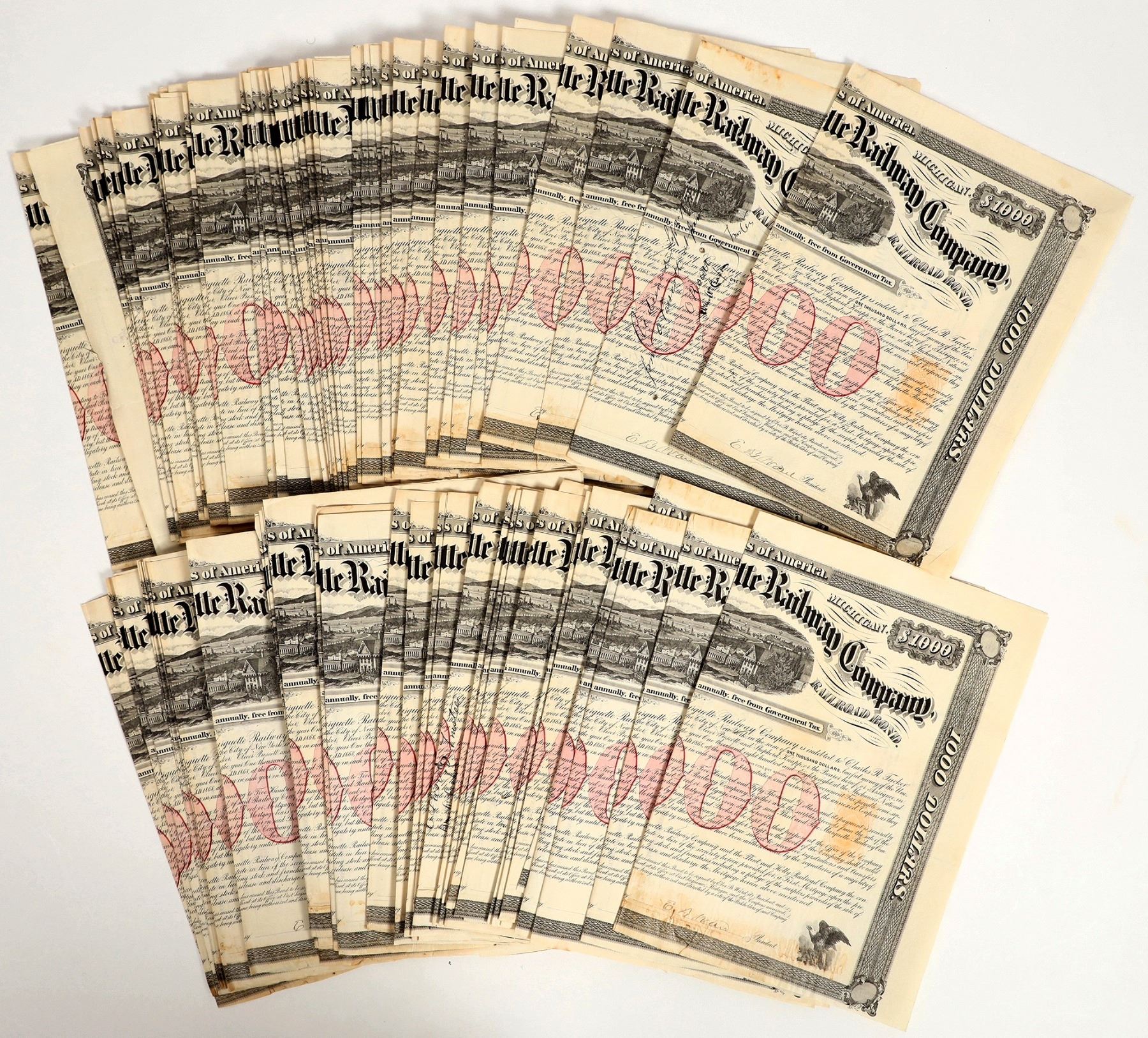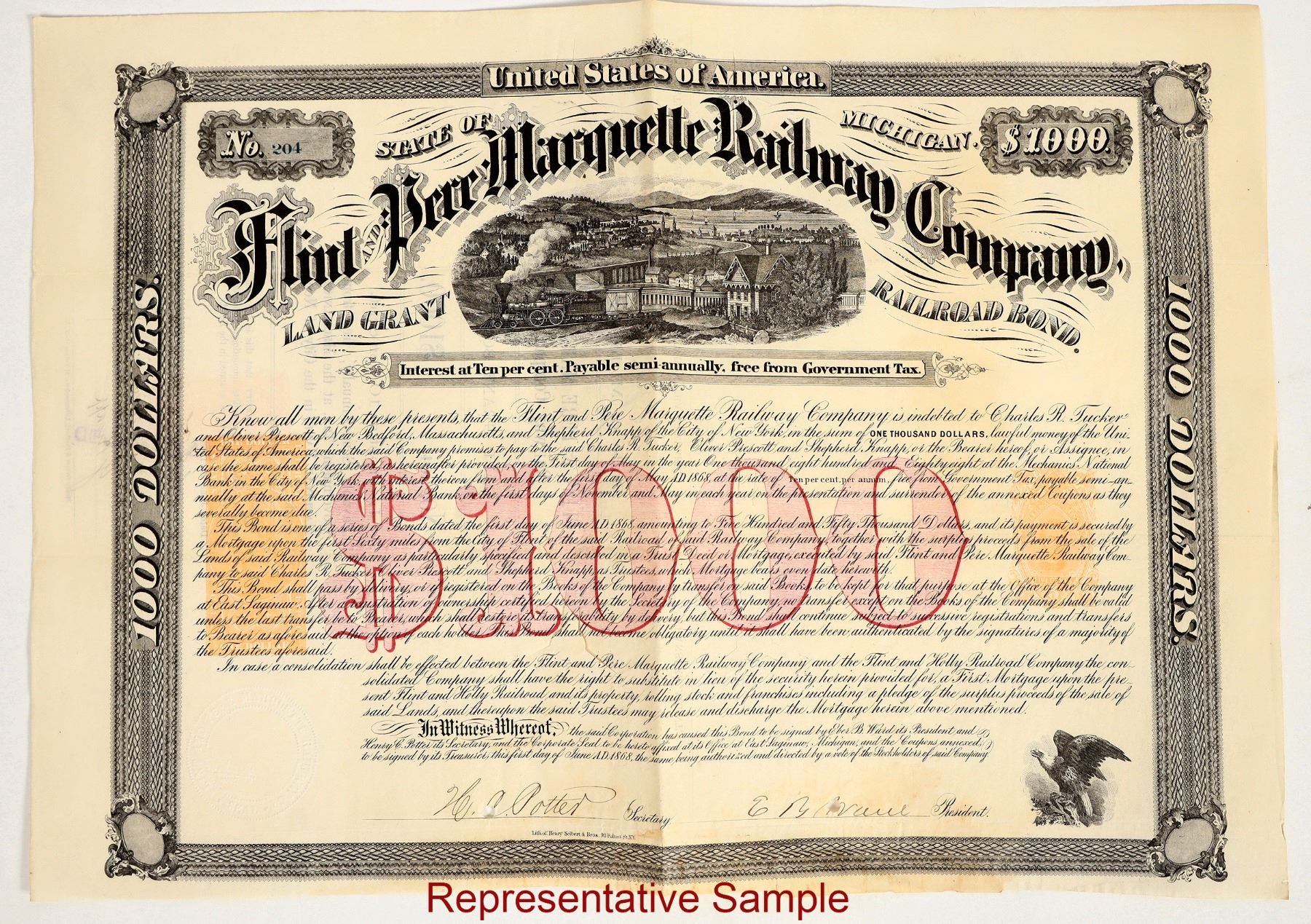 Approx.50+.I/U, I/C. VG or better. cond. Dateline 1868. The Flint and Pere Marquette Railroad Co. , Michigan, East Saginaw. Imprinted RN W and RN P on front, RN P on verso.