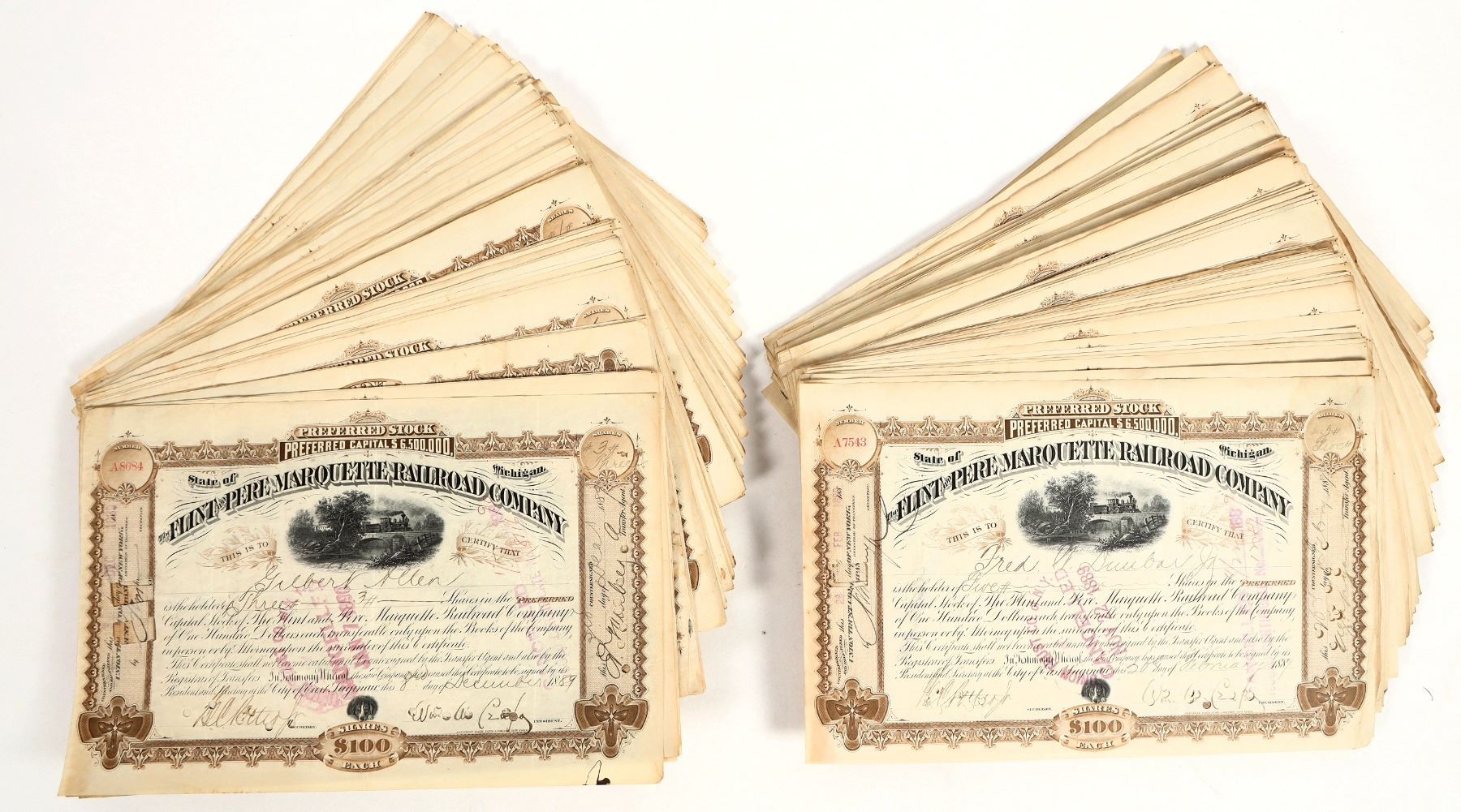 75+. I/C. Issued 1889-90. VG or better. The Flint and Pere Marquette Railroad Co. 1857-1899. Merged into the Pere Marquette Railway.