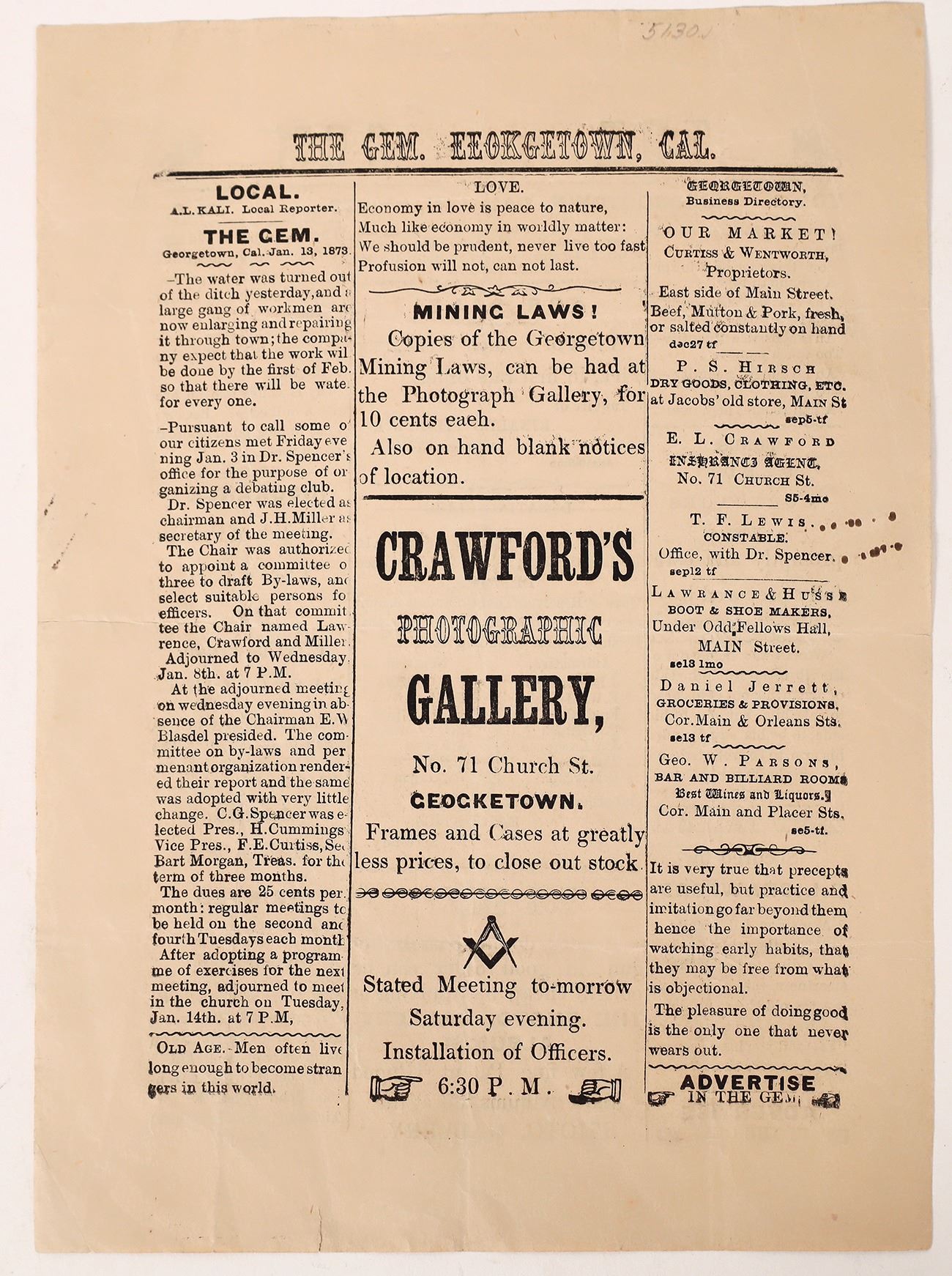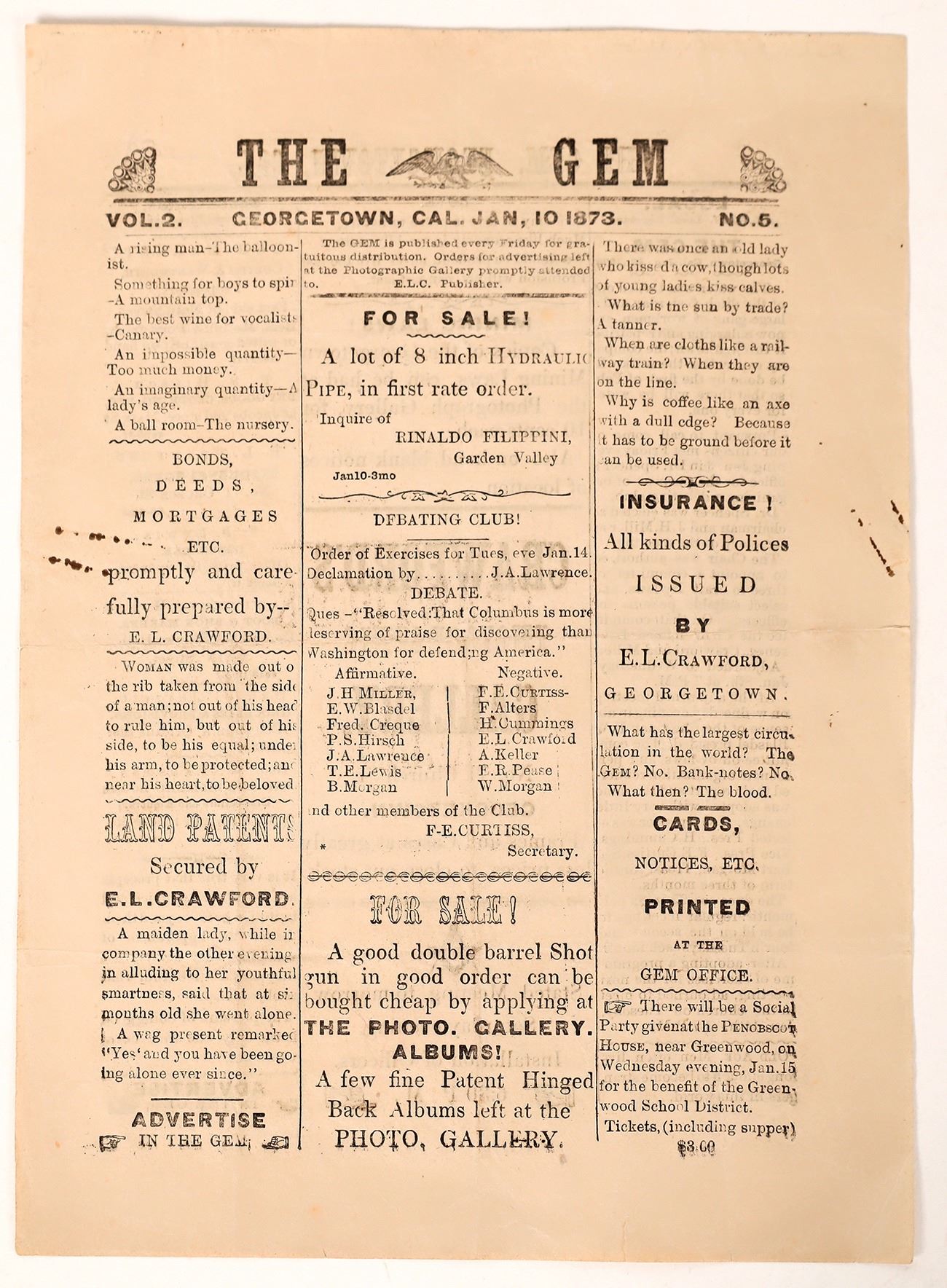 Rare The Gem newspaper, Jan. 10 1873. 2 sided, little local news including events, mostly local ads. California Georgetown 1873