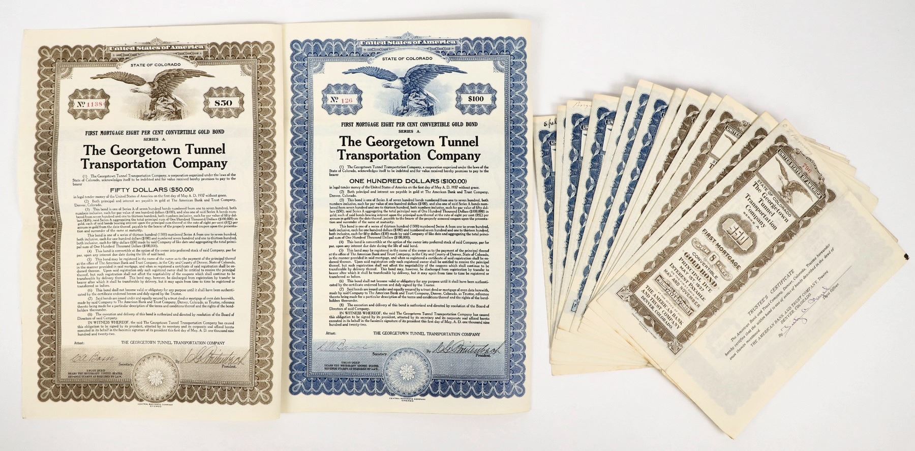 lot of 16. I/U. Issued 1922. Fine or better. The Georgetown Tunnel Transportation Co., $50 &100, 8% gold bearer bonds, with coupons. Two varieties. Central BNC printer.