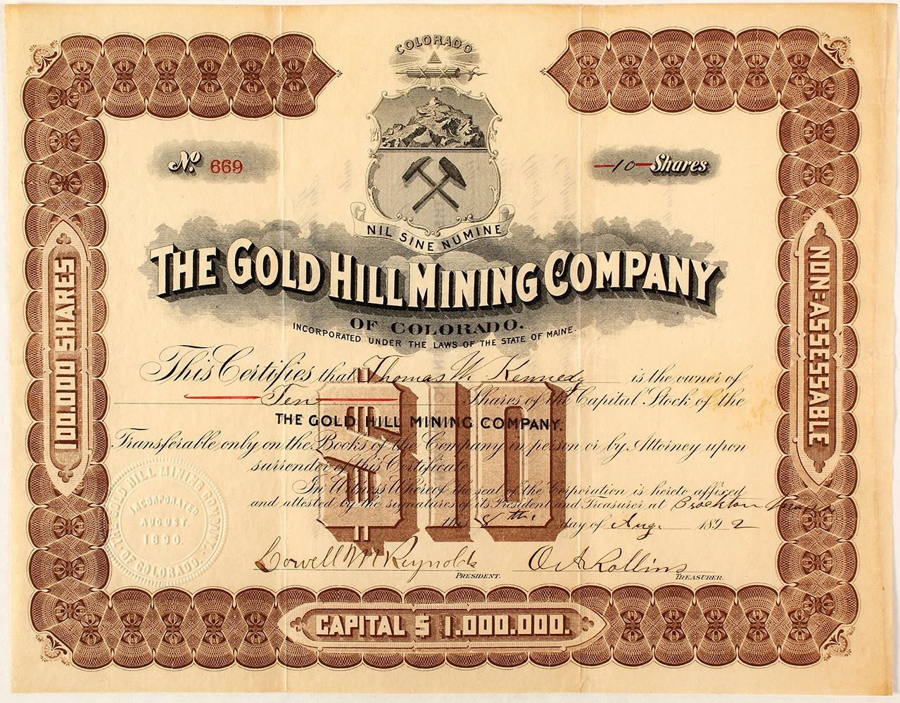 Inc. in Maine. No. 669, issued for 10 shares to Thomas W. Kennedy on Aug. 8th, 1892. Signed by treasurer Rollin and president Cowell M. Reynolds. Large certificate with maroon border and fancy logo with the Colorado state seal above it. No printer listed. Folds, creases and some toning. 9 x 11.5" Not in Filer. Located at Georgetown, according to the 1893 Report of the Colorado Secretary of State. (Al Adams Gold Rush Memorabilia Collection) Date: Location: Georgetown, Colorado HWAC# 58433