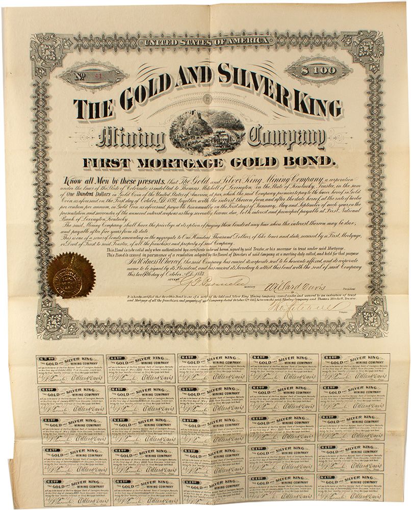 $100 First Mortgage Gold bond, Cert. #41, issued in 1883. Signed by Willard Davis as president. Twenty seven coupons attached at the bottom. The company's headquarters were in Topeka, Kansas and Lexington, Ky. Six miles from Pittsburg, Colorado was Dark Canon where the company's Silver King mine was located. The Silver King was a large vein of galena in cretaceous shales. Ore grades were from 10-200 oz. silver per ton with some samples also showing 1 oz. of gold (E.M.J. Vol. 38, 1884, pp. 88). Vignette of a small hamlet in the hills. The coupons were payable in gold coin. VF.City: Dark CanonCounty: GunnisonState: CODate: