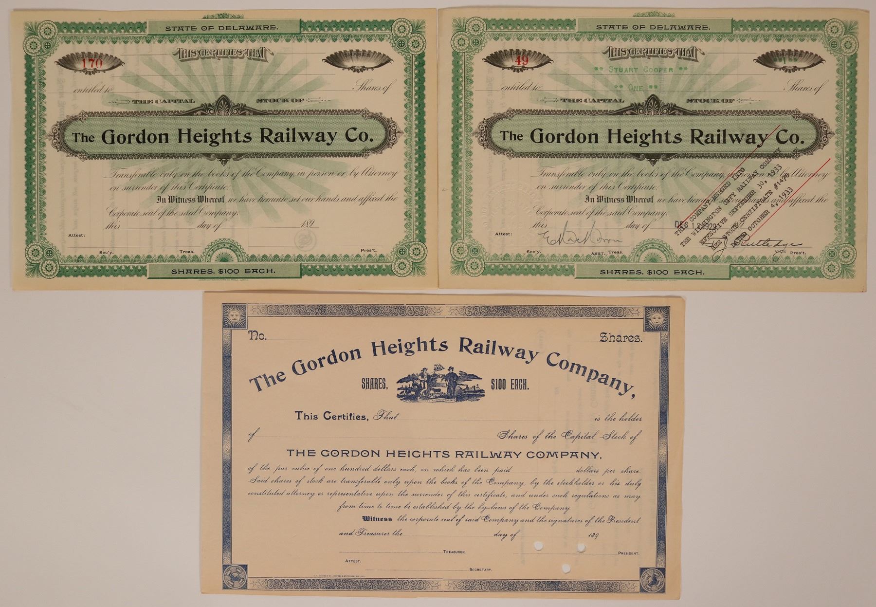 3 certificates. Incorp 1893 Delaware and merged into The Wilmington City Railway Co. when streetcars became electric. Two Green,, $100 par, no vignette, American Bank Note Co printer. #170, U/U, dateline 189_. #49, I/C, 1 share issued Dec 12, 1929. Blue, U/C, not numbered, state seal under title, C.F. Thomas & Co. printer.