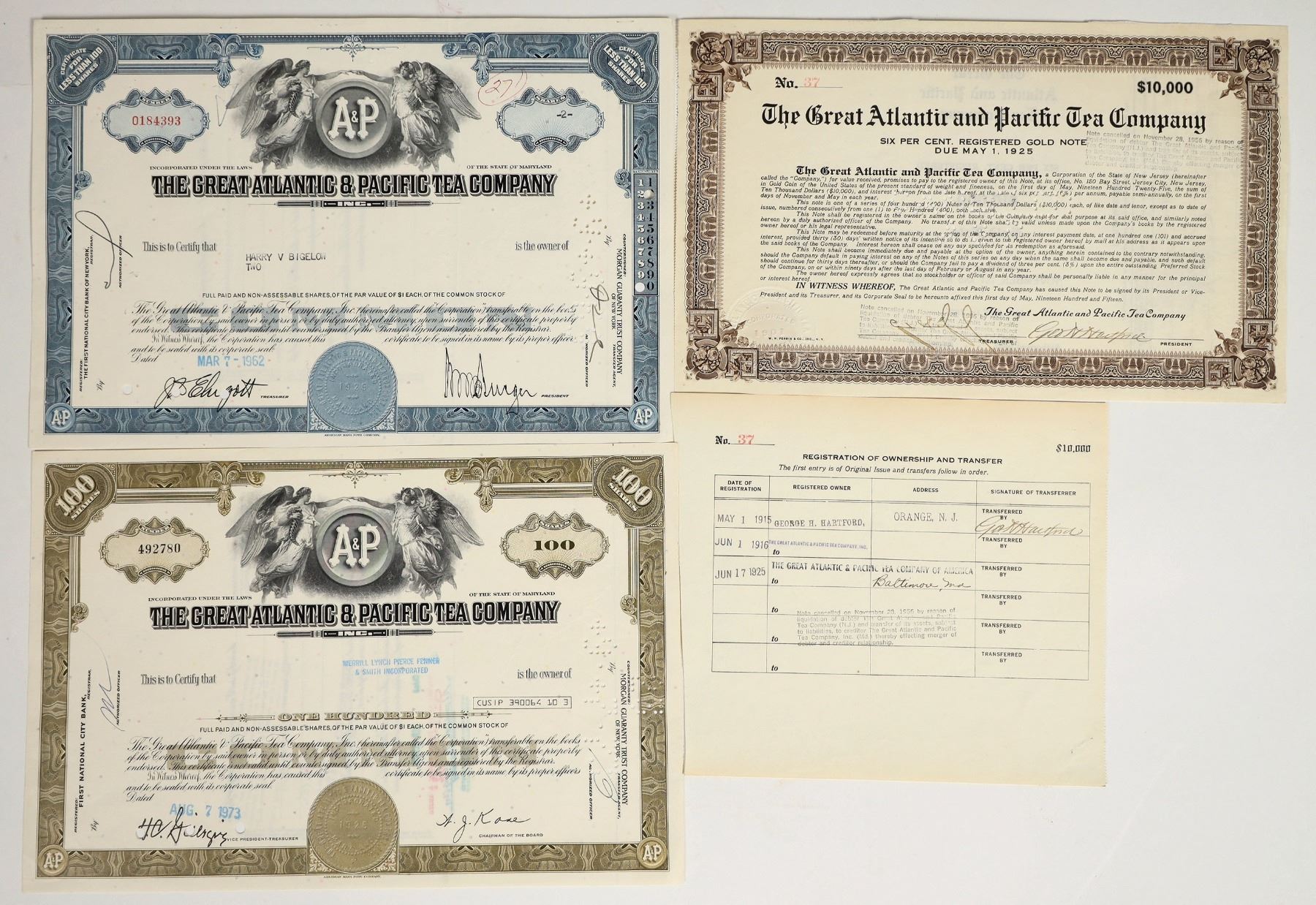 Lot of 3. I/C. Issued 1915-73 The Great Atlantic and Pacific Tea Co.. Three different stocks: 100 shares, less that 100 shares and 6% registered gold note issued 1015 and due 1925. EF. cond. Printers W. N. Perrin & Co., American BNC. All are in protective sleeves and come with a background research on the company.