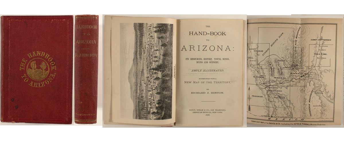 Hinton, R.J.; The Handbook to Arizona; 1878; Payot, Upham & Co., San francisco.431pp, plus 101pp appendix, plus 143pp advertisements. Red boards, gilt lettered front and spine. Minor wear, still tight. Inscription in purple pencil datelined Gold Hill, Nevada, May 30, 1882. This copy was a birthday gift from Uncle John Parrish to E. Poster Kenyon. The Kenyon family was associated with mining in Nevada, though we couldn't find an exact record of these names. This book was possibly published in response to Hodge, 1877. Hodge had been the first since Mowry to report on Arizona mines and mining camps, but the effort is not as thorough as one would hope for. Hinton hammers the mining districts and includes many wood block prints of the mining camps and mines. It is a major and important reference work of great necessity to any Arizona researcher.City: County: State: AZDate: 1878