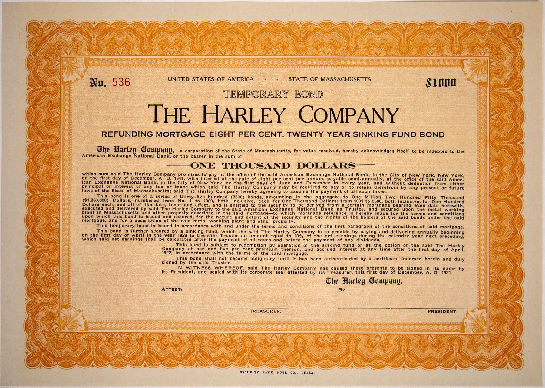 One thousand dollar, 8 percent, 20 year bond, printers proof. Very rare. 1921. We are unsure if this company is related to William S Harley but the size of this bond would indicate a period of major growth for a company of the nature of Harley Davidson.