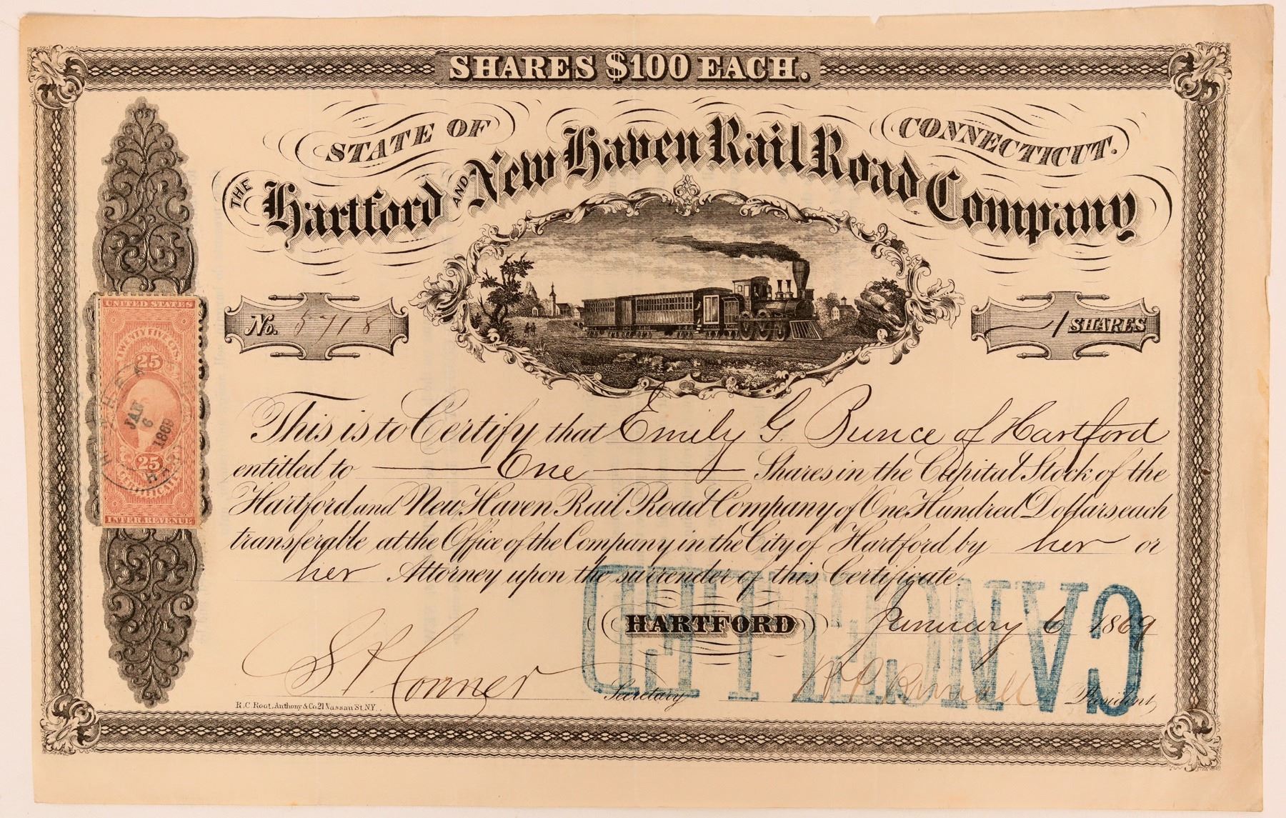 The Hartford and New Haven Railroad of Connecticut was chartered in 1833 to build a railroad between Hartford and New Haven It commenced full operation in 1839 and is an important direct predecessor of the New York, New Haven and Hartford Railroad and ended independent operations in 1872. The main line from New Haven, Connecticut to Springfield, Massachusetts remains in Amtrak service. #5718, I/C, 1 share @ $100 par issued Jan 6 2, 1869 signed N.P. Brunall president. Black, no seal, vignette top train rounding curve under wavy title. 25c revenue stamp left side. R.C. Root, Anthony & Co printer. F