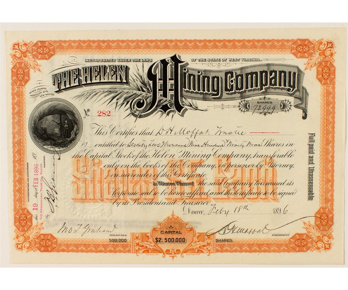 Cert. #282, issued at Denver in 1896. Issued to D.H. Moffatt, Trustee and signed by Moffat as president and M.O.T. Graham Jr. as secretary. Mines located in the Mogollon Mountains, New Mexico printed at the top left. The mine seems to have been in operation for only 10 years in the 1890's (needs confirmation). Whitewater Canyon, site of the famous Catwalk, was a central point in the mining history of this area. The town called both Graham and Whitewater grew up around a mill built by John T. Graham in 1893 and lived less than 10 years. All that remains to mark the spot is part of the mill walls still clinging to the west side of the canyon near the entrance to The Catwalk. The mines above the canyon were worked from their discover in 1889 until 1942 (Billy the Kid's stepfather, William Antrim, was a blacksmith at Graham). The Helen Mining Company was first to develop 13 claims about 4 miles upstream from the mill which could not be built closer to the mines because of the rough, narrow canyon. A 3 mile long, 4" metal pipeline provided a continuous water supply to the town and its electric generator. David H. Moffat was one of Denver’s most important financiers and industrialists in late 19th and early 20th century Colorado, and over the years he had claims to over one hundred Colorado mines and nine railroads. Moffat was president of the Denver and Rio Grande Railway from 1887 to 1891. The Moffat Tunnel and Moffat County, Colorado are named for him. Nice signature piece. Homer Lee Bank Note Co., N.Y. Unc. VF.City: WhitewaterCounty: CatronState: NMDate:
