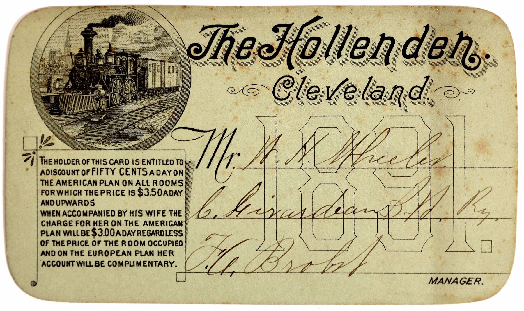 Unusual pass from a large railroad and steamer collection. This pass is issued to HH Wheeler for 1891, giving him 50cents a day discount on rooms in the American Plan. Signed by the hotel manager. Front has vignette of a locomotive. Reverse has a vignette of the hotel. Foxing, scuff on reverse. Printed on green cardstock. The Hollenden Hotel was a luxury hotel in downtown Cleveland, Ohio that opened in 1885. It contained 1,000 rooms, 100 private baths, a lavish interior, electric lights and fireproof construction. As Cleveland's most glamorous hotel of the time, it hosted industrialists, celebrities and politicians, including five U.S. Presidents. It was demolished in 1962.