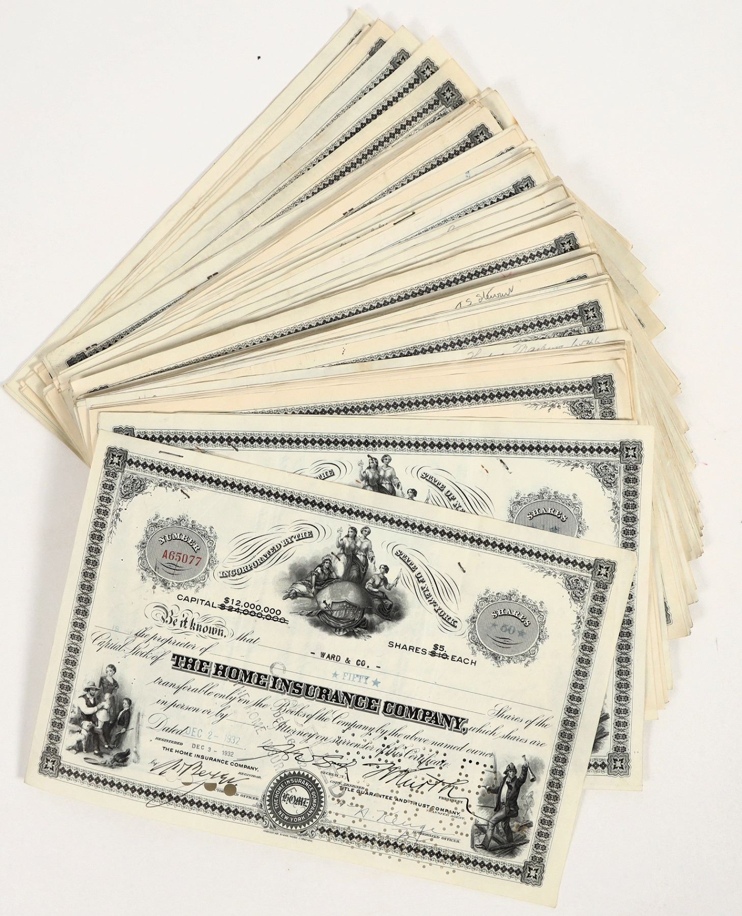 Lot of approx. (200) stock certificates issued by the "Home Insurance Company." These are fore various shares, all punch and stamp cancelled. Reverse sides are fully executed and stamped, the majority have various revenue stamps affixed. there are multiple vignettes on the front at center and both corners, graphics by the American Bank Note Company. Overall condition is good to very good, some exhibiting minor stains and/or fold issues. Please see photos.