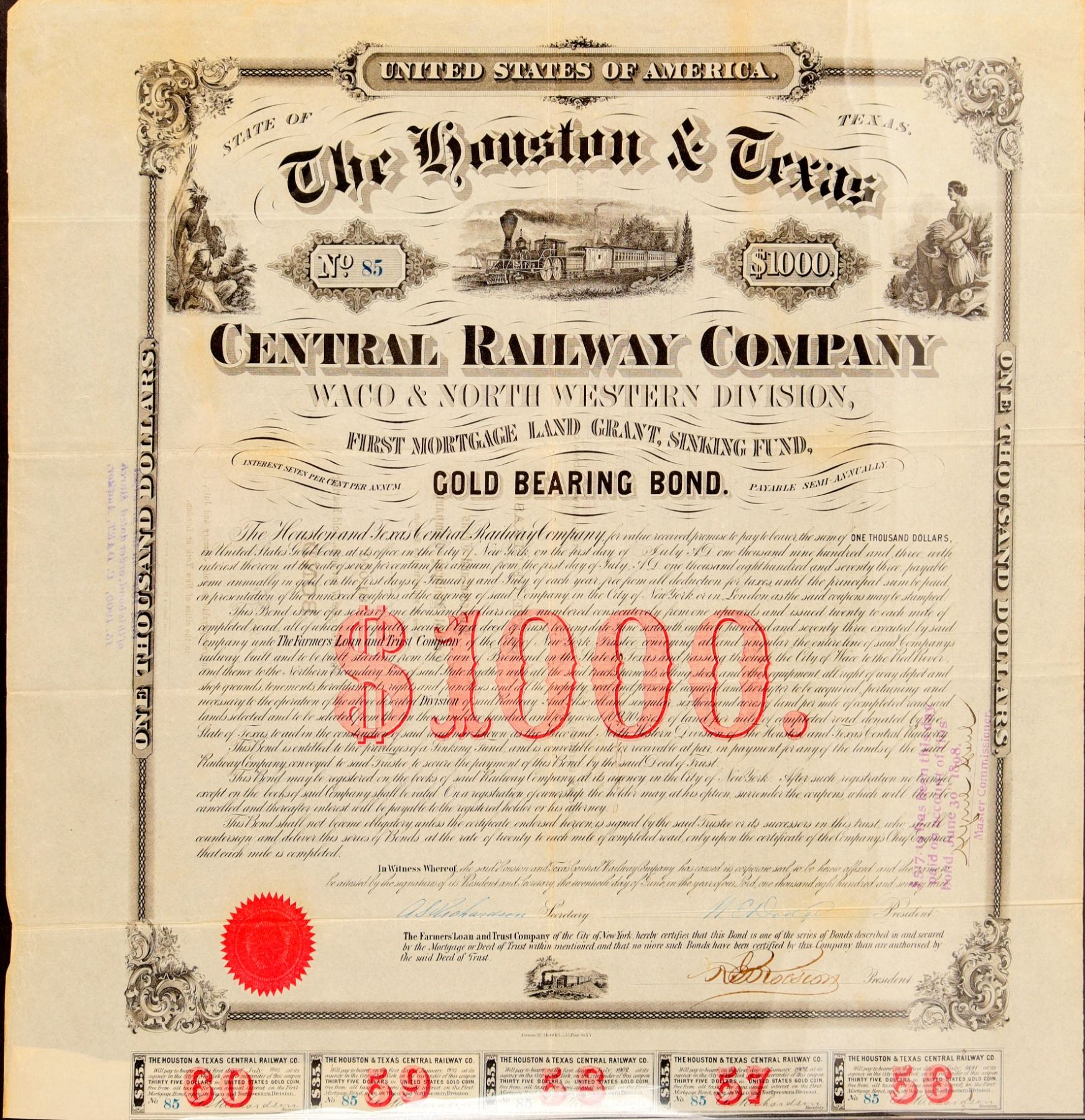 The Houston & Texas Central Railway Co. Waco & North Western Division. #85, I/U, $1000 7% 30 year First Mortgage Land Grant, Sinking Fund gold bearer bond due 1903. Issued June 20, 1873 signed W.E. Dodge, BLACK, red embossed seal. Vignettes: bottom train passing country side, upper left Indians looking l-r, center American 4-4-0 passenger train, right allegorical female agriculture looking r-l. "$1000" red underprint, 7 coupons attached, Cowan, McClure & Co printers. Has been folded, EF condition. Ken Prag Collection