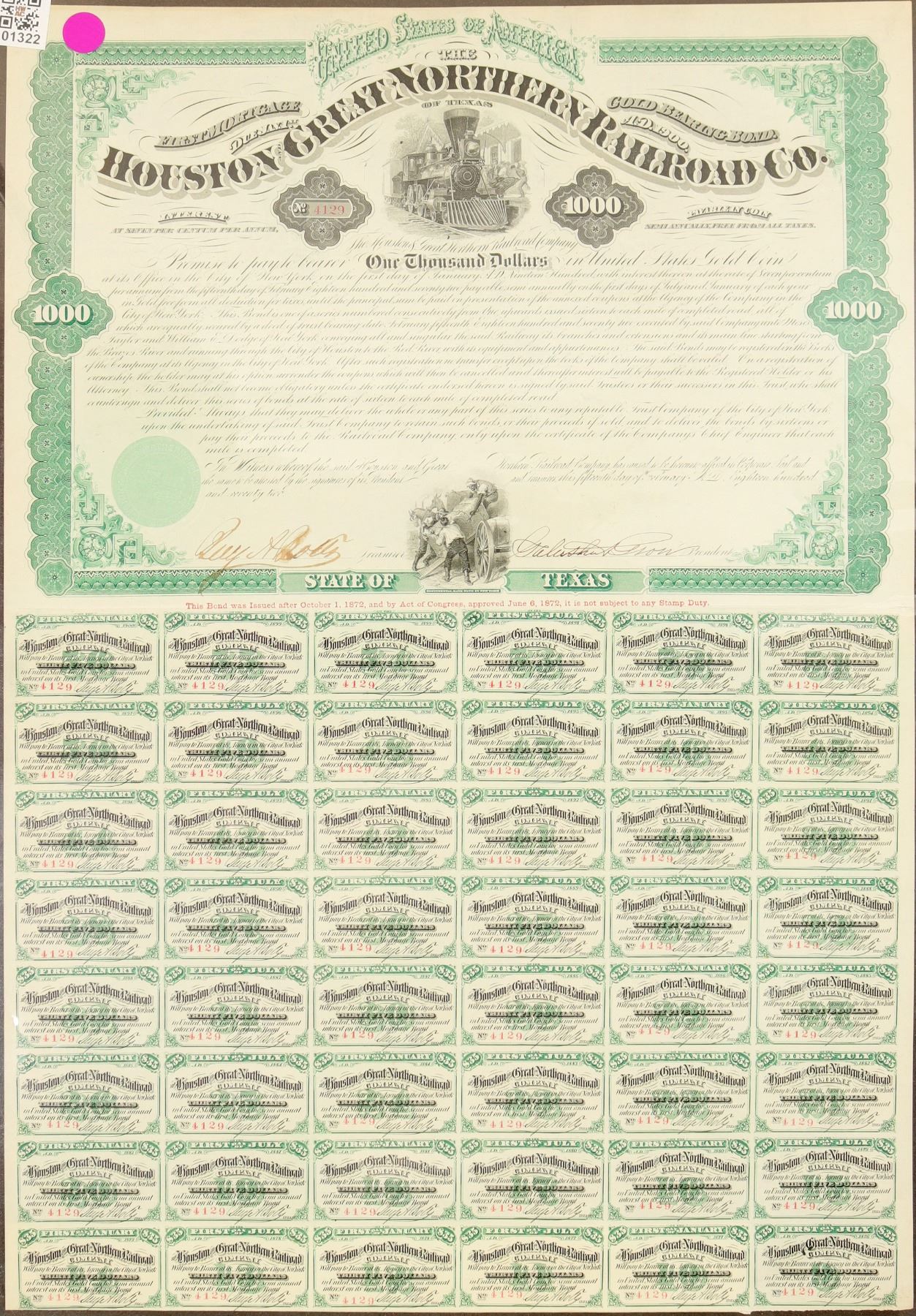 #4129 , I/U, $1000 7% First Mortgage tax free 28 year gold bearer bond due1900. Issued Feb 15, 1872 signed Galusha Aaron Grow President, GREEN, embossed seal (loco center). Vignettes: bottom men loading hay on wagon, top American 4-4-0 @depot l-r (same vignette on reverse), 53 coupons attached. Continental Bank Note Co. printer. AU Ken Prag Collection