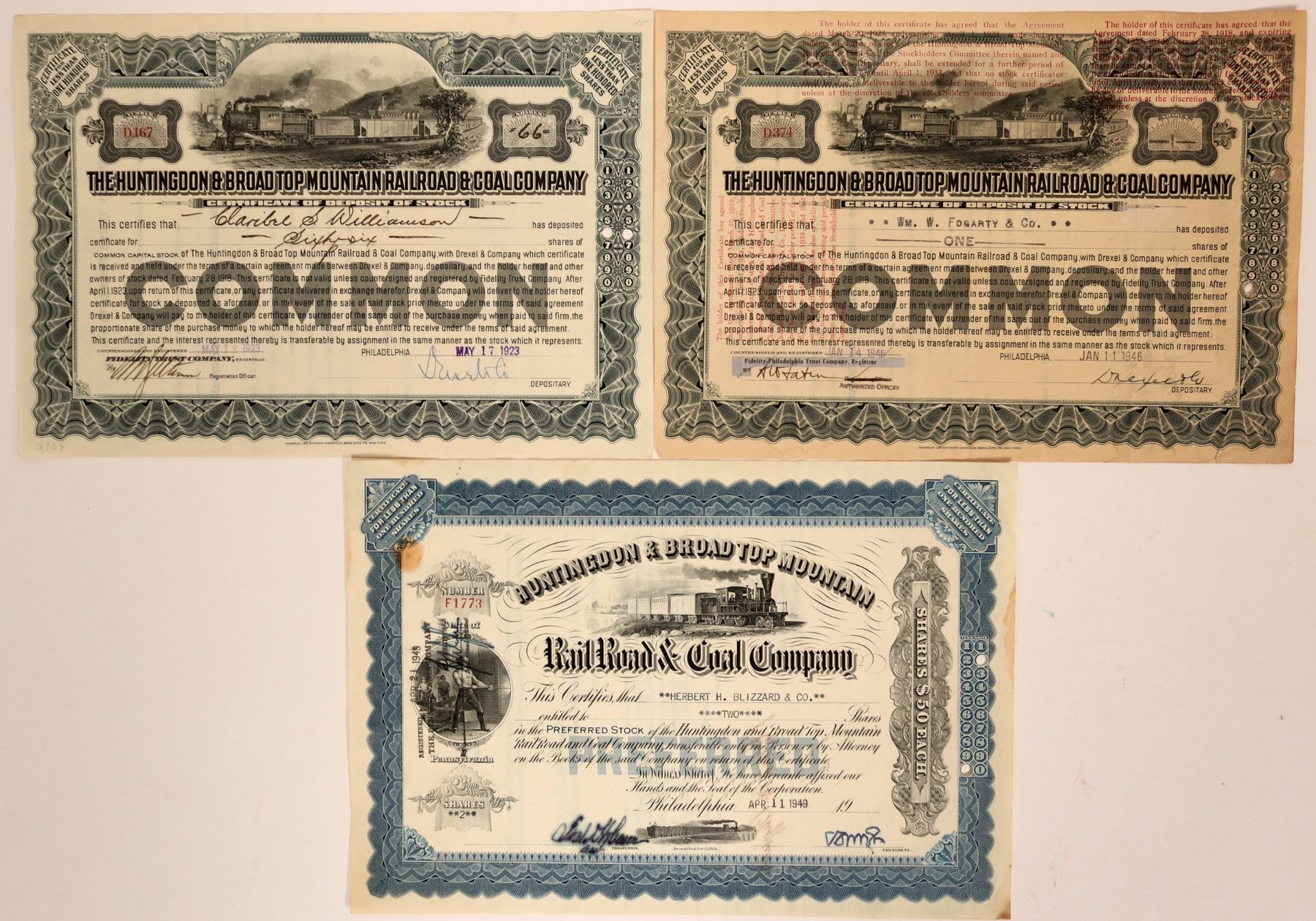 incorp. 1853 The purpose of the line was to provide a rail link from Huntingdon to Bedford, and to provide a competitive alternate route to local coal producers . #F1773, I/U, 2 shares @ $50 par issued April 11,1949 signed L.T. illegible. Blue, embossed seal w.center train, Vignettes: top train w.cars l-r, left iron worker, bottom coal train l-r from rear view. American Bank Note Co. printer. VF. Two Certificate of Deposit of Stock. Both I/U, signed illegible, olive. vignette top train w/coal cars l-r. COMMON in olive underprint. Franklin Lee Div American Bank Note Co. printer. #D167, 66 shares Issued May 17, 1923. VF. #D374 One share issued Jan 11,1946. F cond.