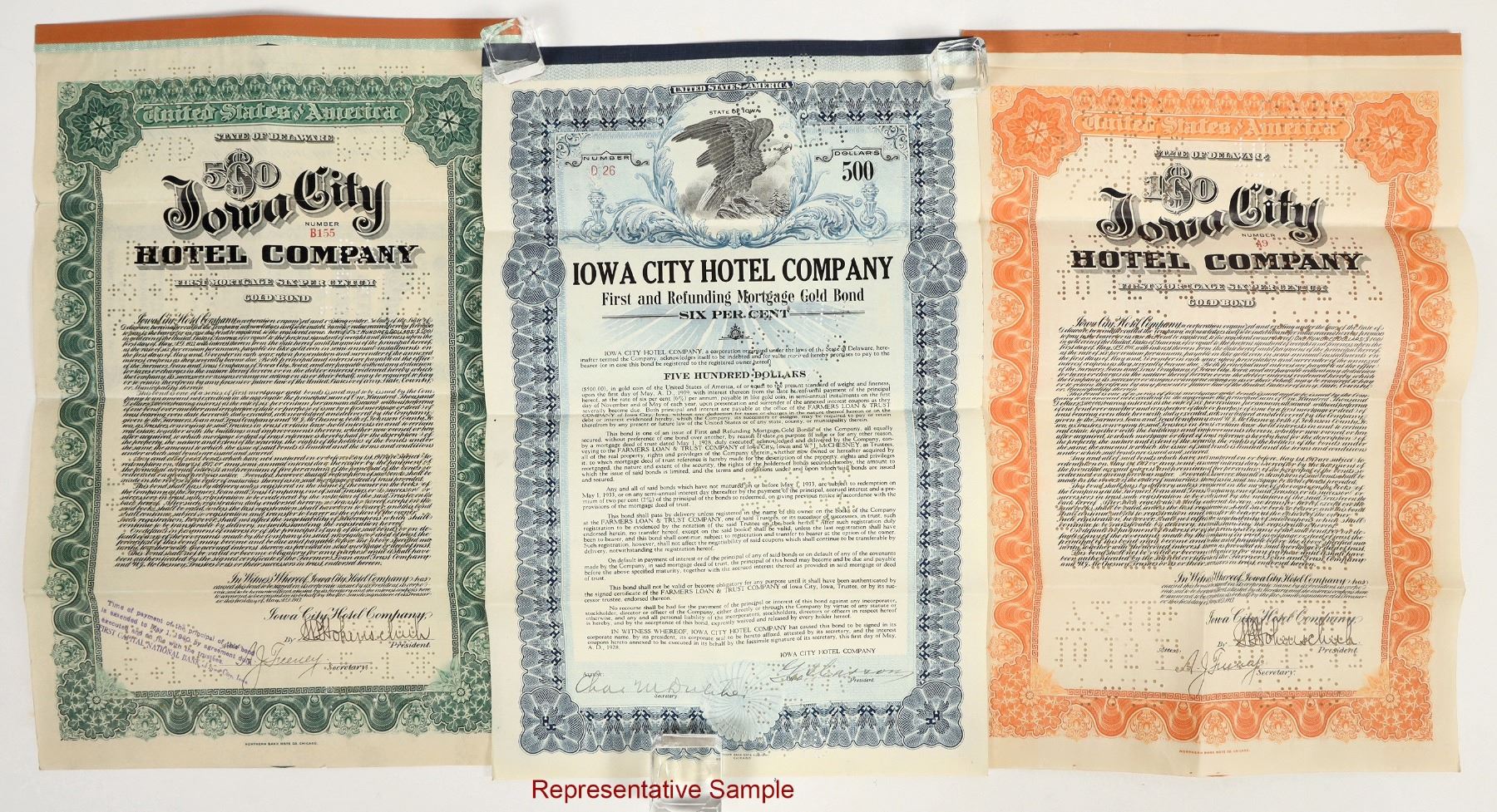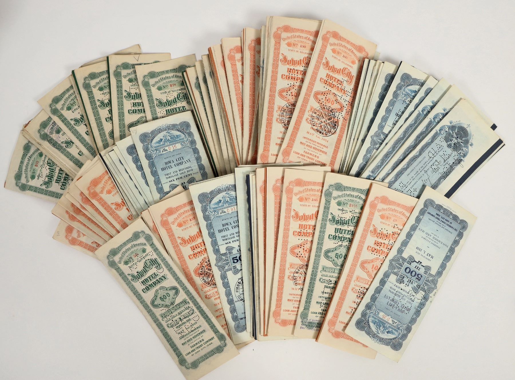 Approx75+. All I/C. Issued 1913-33. The Iowa City Hotel Co. Bonds Original sold to construct the Jefferson Hotel in Iowa City.. VG or better.
