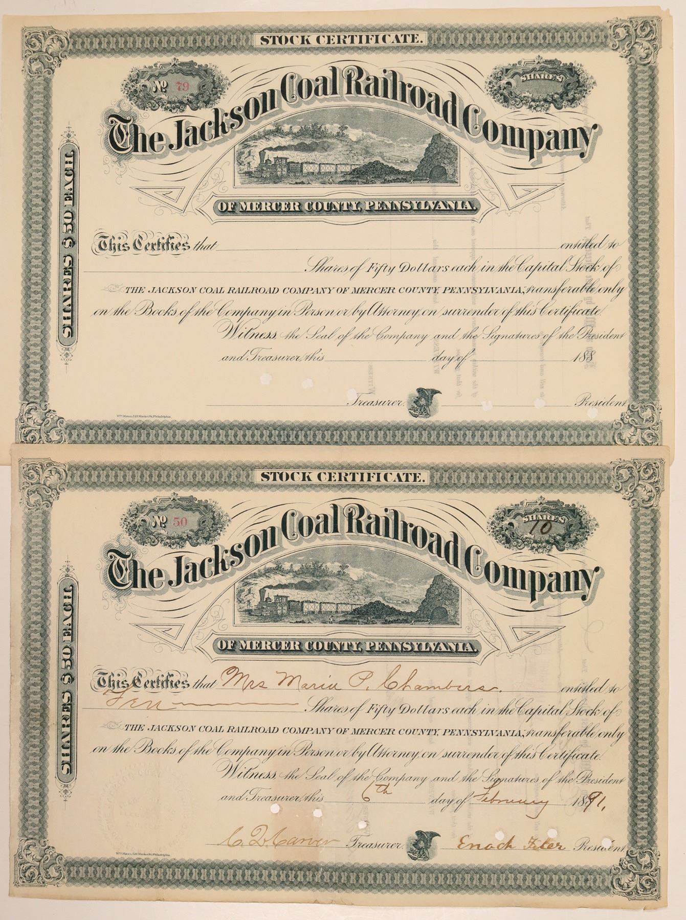 Two certificates. Incorp Pennsylvania Feb. 26, 1883 to build ten miles of track south from the end of Mercer's spur to Grove City. Both certificates: Blue, $50 par shares, vignette 4-4-0 train r-l w/coal cars under wavy title, Wm Mann printer. #79, U/C, near AU w/cancel punch holes.