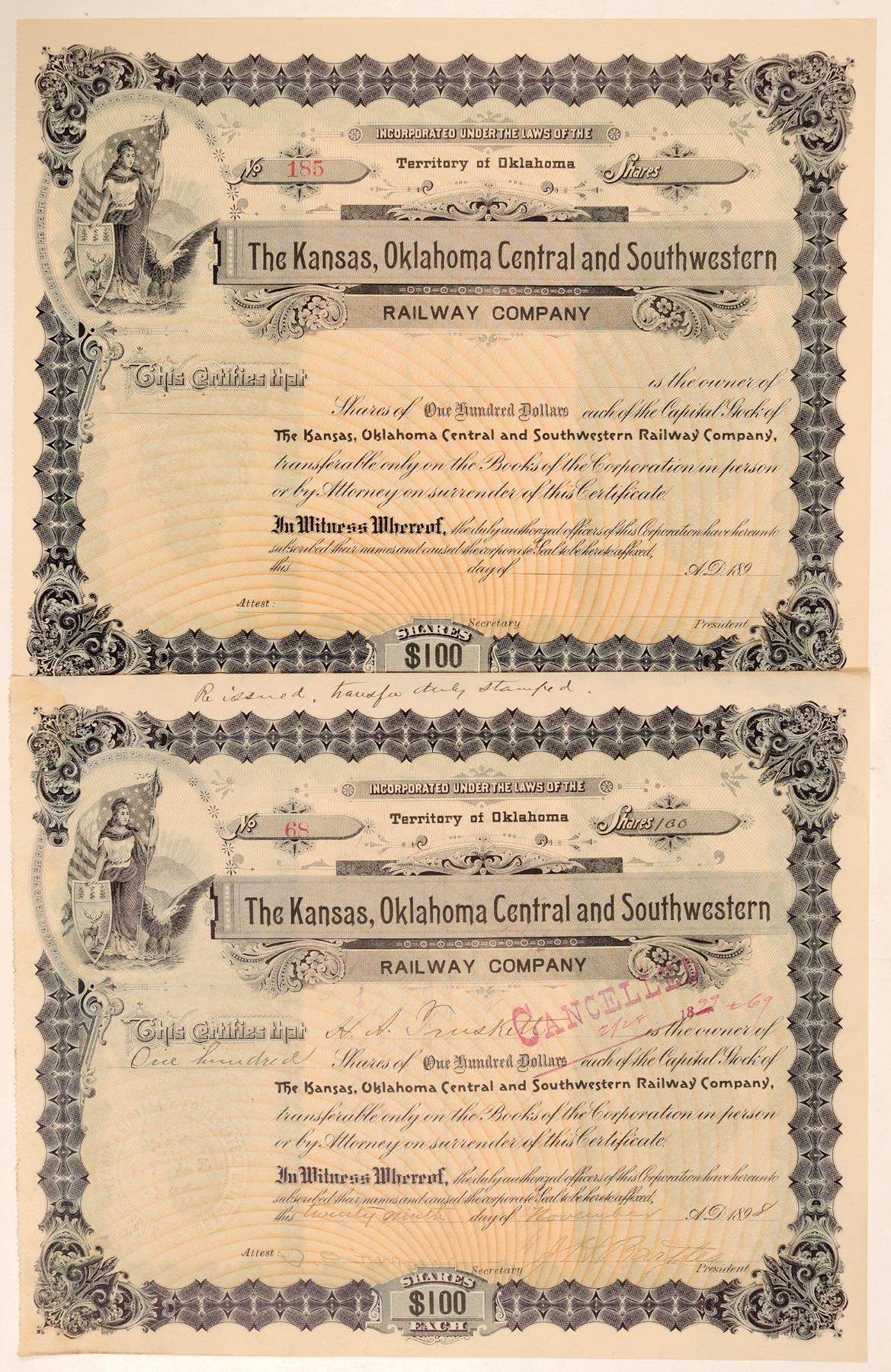 2 stocks, one issued and one unissued. Incorp. August 1894 Territory of Oklahoma building through Indian and Oklahoma territory. #185 unissued, dated 189_. in EF cond. #68, I/C, 100 shares @ $100 par issued Nov 29, 1898, embossed seal. BLACK w/ orange semi-circle underprint. Vignette left Columbia w/eagle spread winged. EF. Unknown printer. Ken Prag Collection